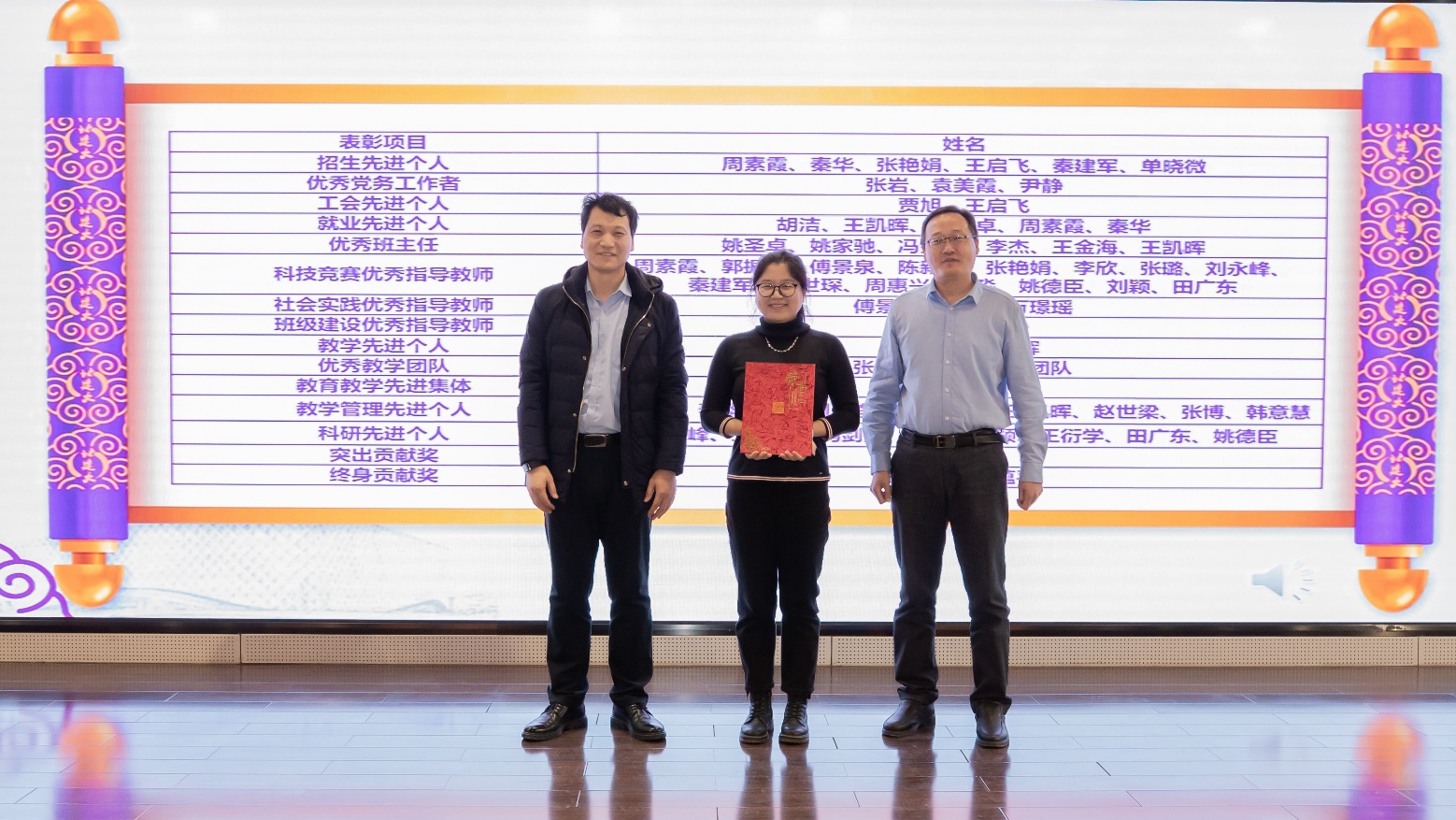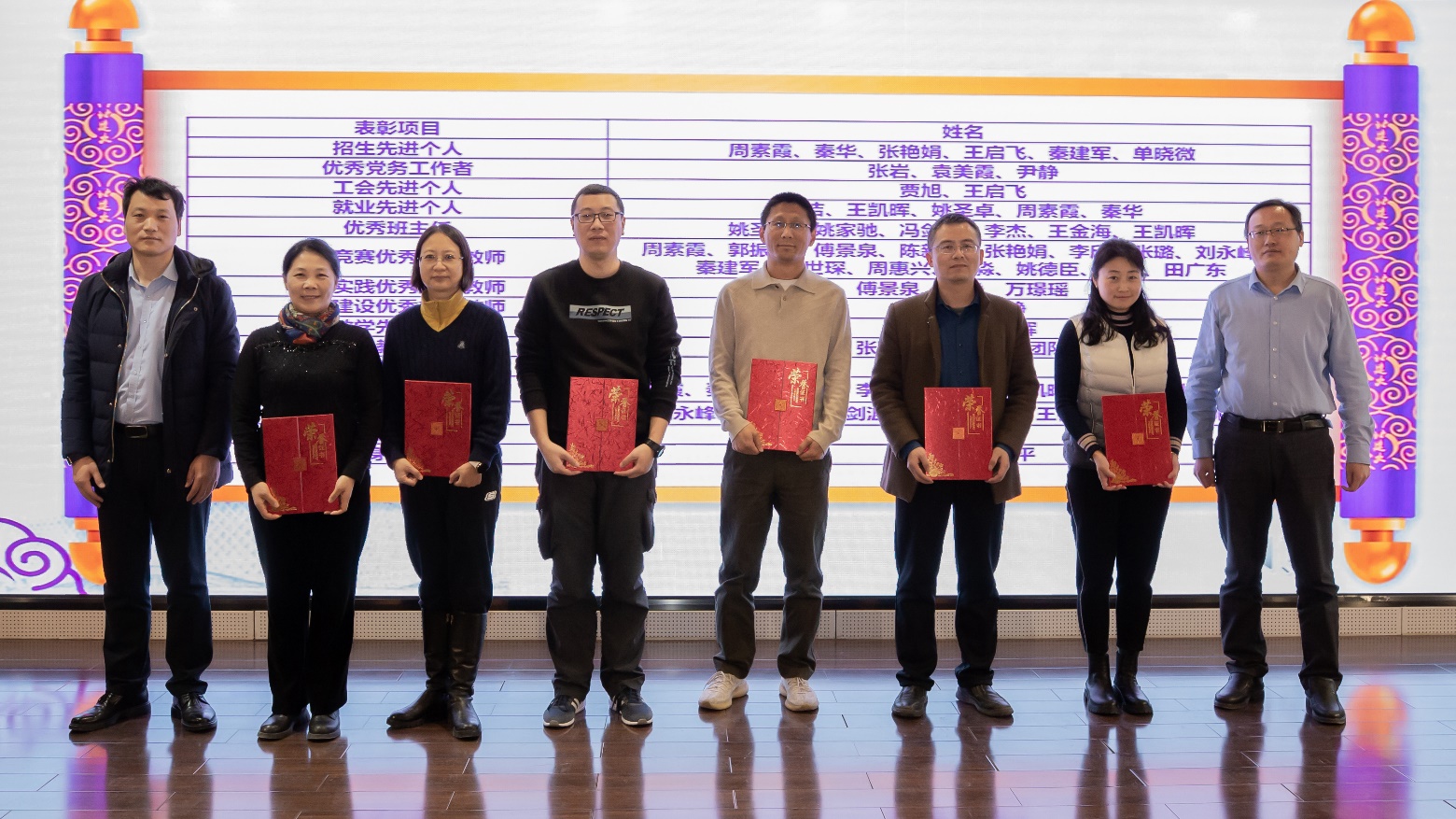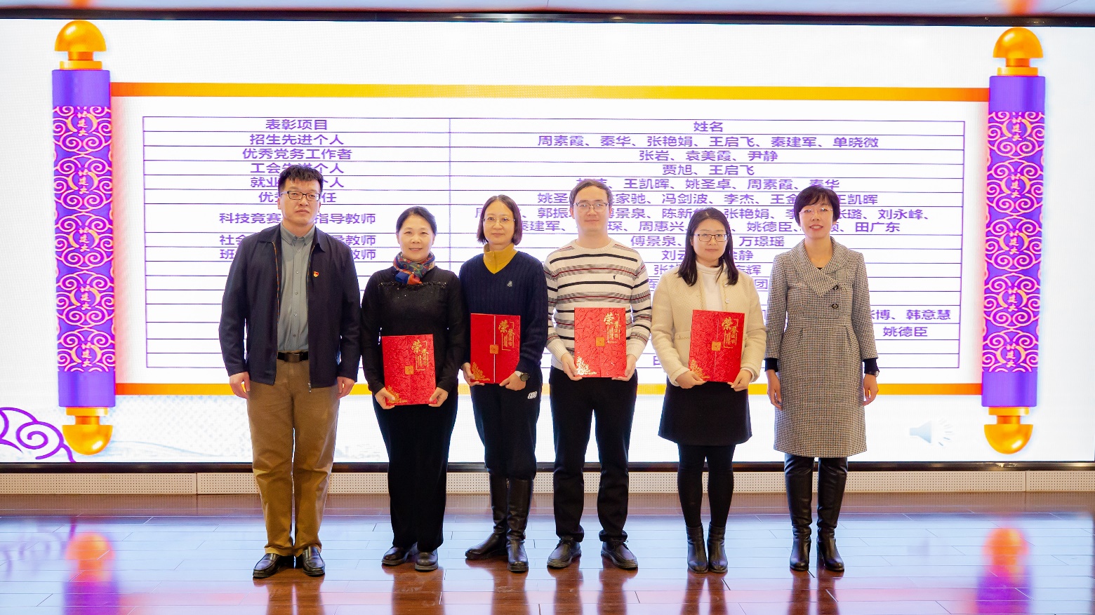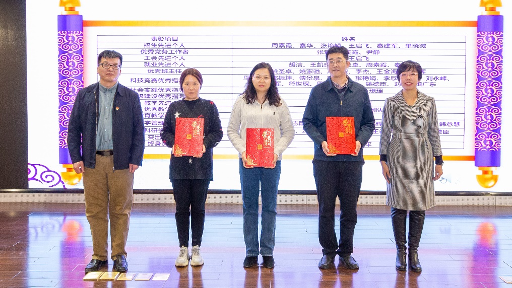 党委副书记李文超宣读《关于表彰周素霞等先进集体及个人的决定》。本次表彰共计2个团队获得优秀教学团队,1个团队获得教育教学先进集体,6名教师获得招生先进个人,3名教师获得优秀党务工作者,2名教师获得工会先进个人,5名教师获得就业先进个人,6名教师获得优秀班主任,15名教师获得科技竞赛优秀指导教师,3名教师获得社会实践优秀指导教师,2名教师获得班级建设优秀指导教师,2名教师获得教学先进个人,9名教师获得教学管理先进个人,8名教师获得科研先进个人,1名教师获得突出贡献奖,2名教师获得终身贡献奖。
