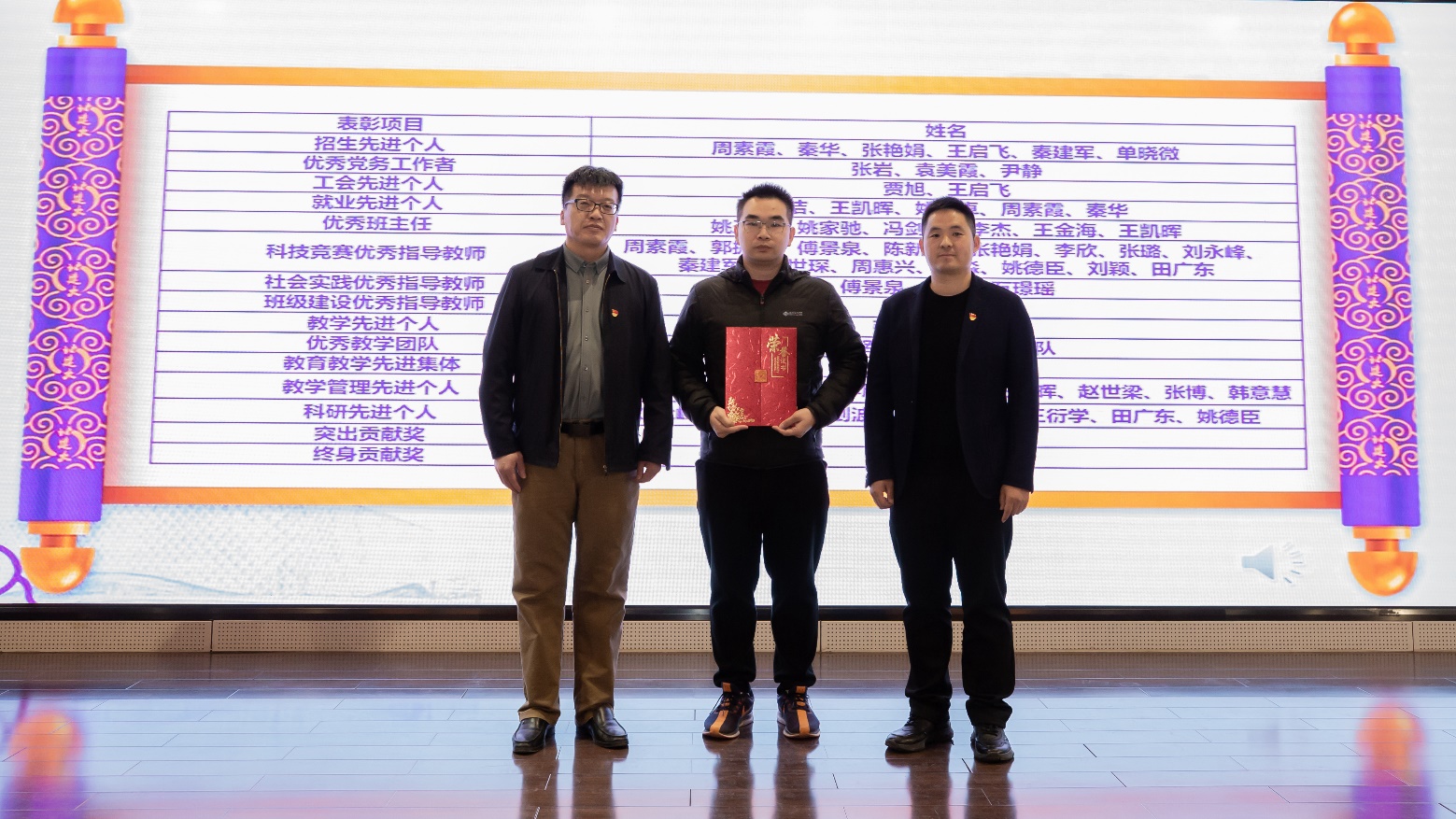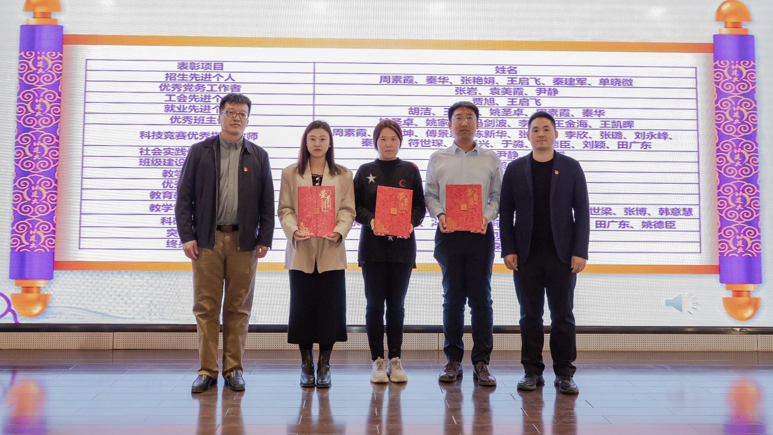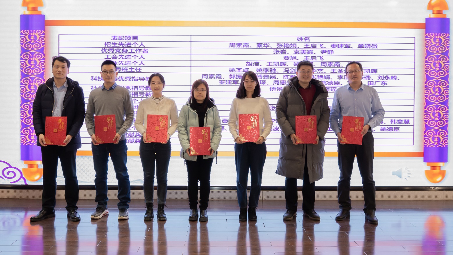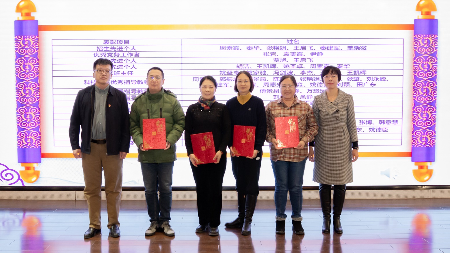 党委副书记李文超宣读《关于表彰周素霞等先进集体及个人的决定》。本次表彰共计2个团队获得优秀教学团队,1个团队获得教育教学先进集体,6名教师获得招生先进个人,3名教师获得优秀党务工作者,2名教师获得工会先进个人,5名教师获得就业先进个人,6名教师获得优秀班主任,15名教师获得科技竞赛优秀指导教师,3名教师获得社会实践优秀指导教师,2名教师获得班级建设优秀指导教师,2名教师获得教学先进个人,9名教师获得教学管理先进个人,8名教师获得科研先进个人,1名教师获得突出贡献奖,2名教师获得终身贡献奖。