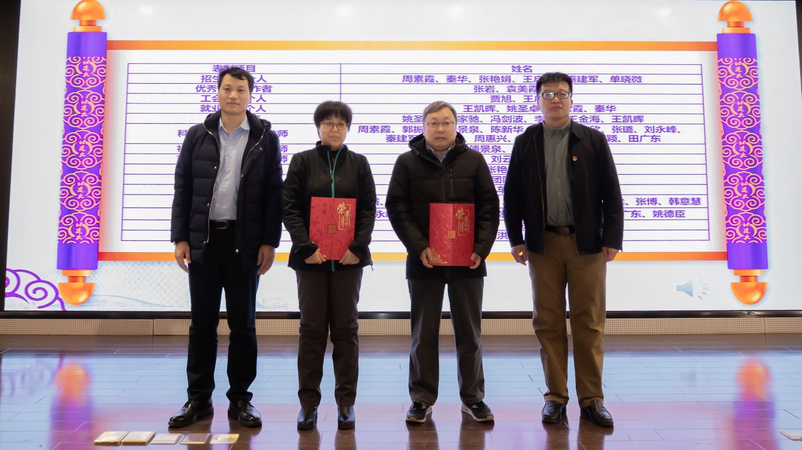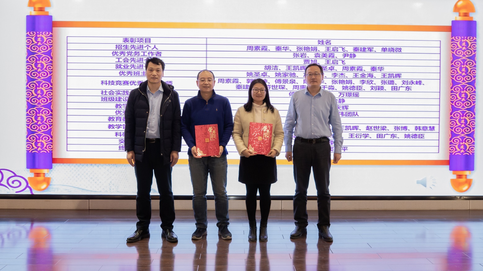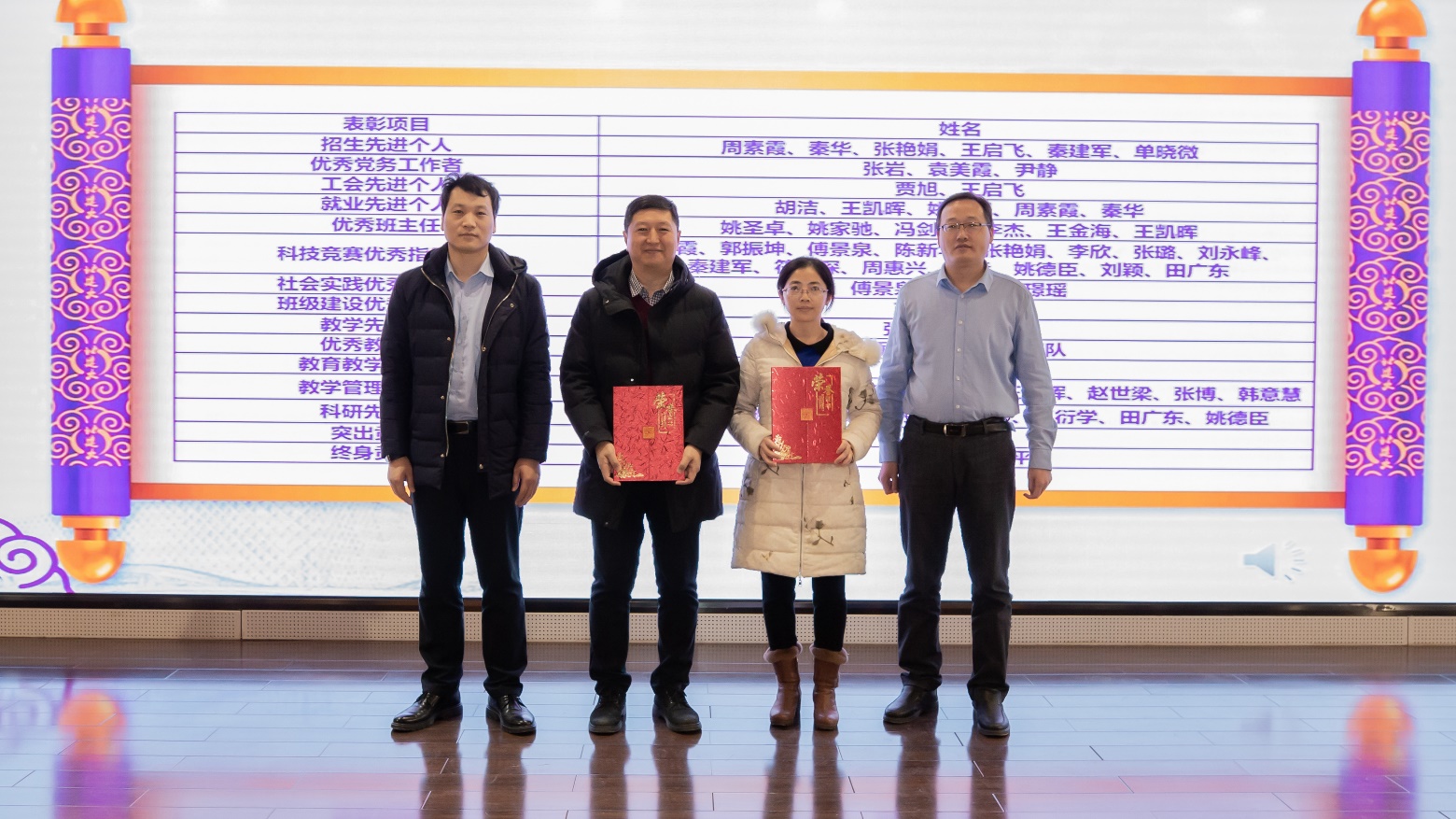 党委副书记李文超宣读《关于表彰周素霞等先进集体及个人的决定》。本次表彰共计2个团队获得优秀教学团队,1个团队获得教育教学先进集体,6名教师获得招生先进个人,3名教师获得优秀党务工作者,2名教师获得工会先进个人,5名教师获得就业先进个人,6名教师获得优秀班主任,15名教师获得科技竞赛优秀指导教师,3名教师获得社会实践优秀指导教师,2名教师获得班级建设优秀指导教师,2名教师获得教学先进个人,9名教师获得教学管理先进个人,8名教师获得科研先进个人,1名教师获得突出贡献奖,2名教师获得终身贡献奖。