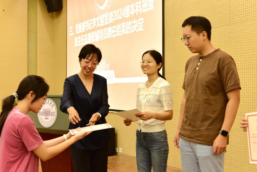 高蕾为24级新生班级班主任代表颁发聘书。