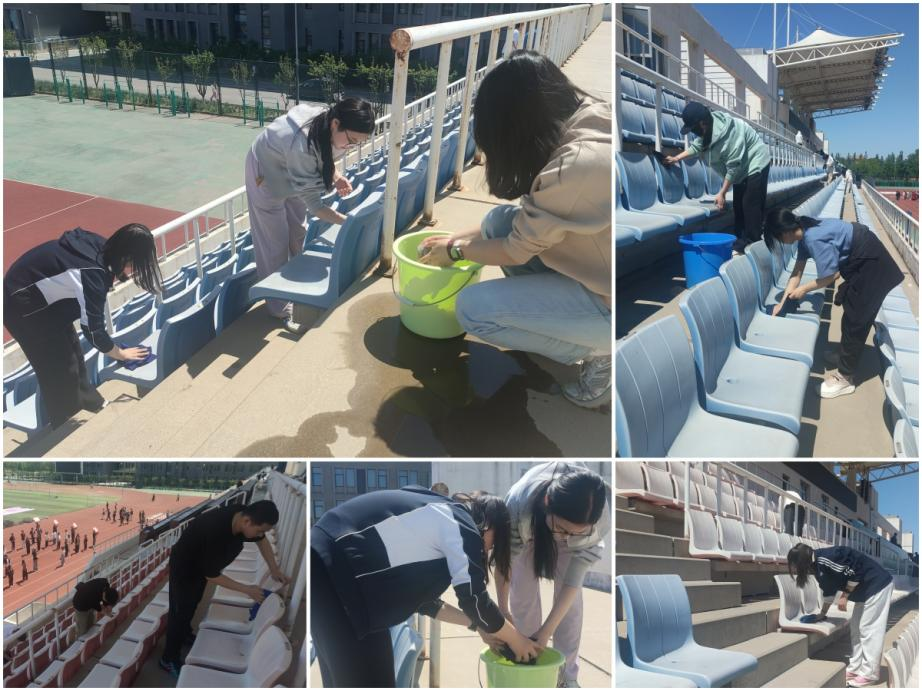 为深入践行学校“五育融合”育人理念,弘扬劳动精神,厚植工匠文化,4月24日,亚色网 依托学校“五育融合”共育园区平台,举办“匠心筑梦·劳动育人”主题劳动实践活动,学院30余名学生到大兴校区西操场,对看台座椅及地面进行了集中清扫。
