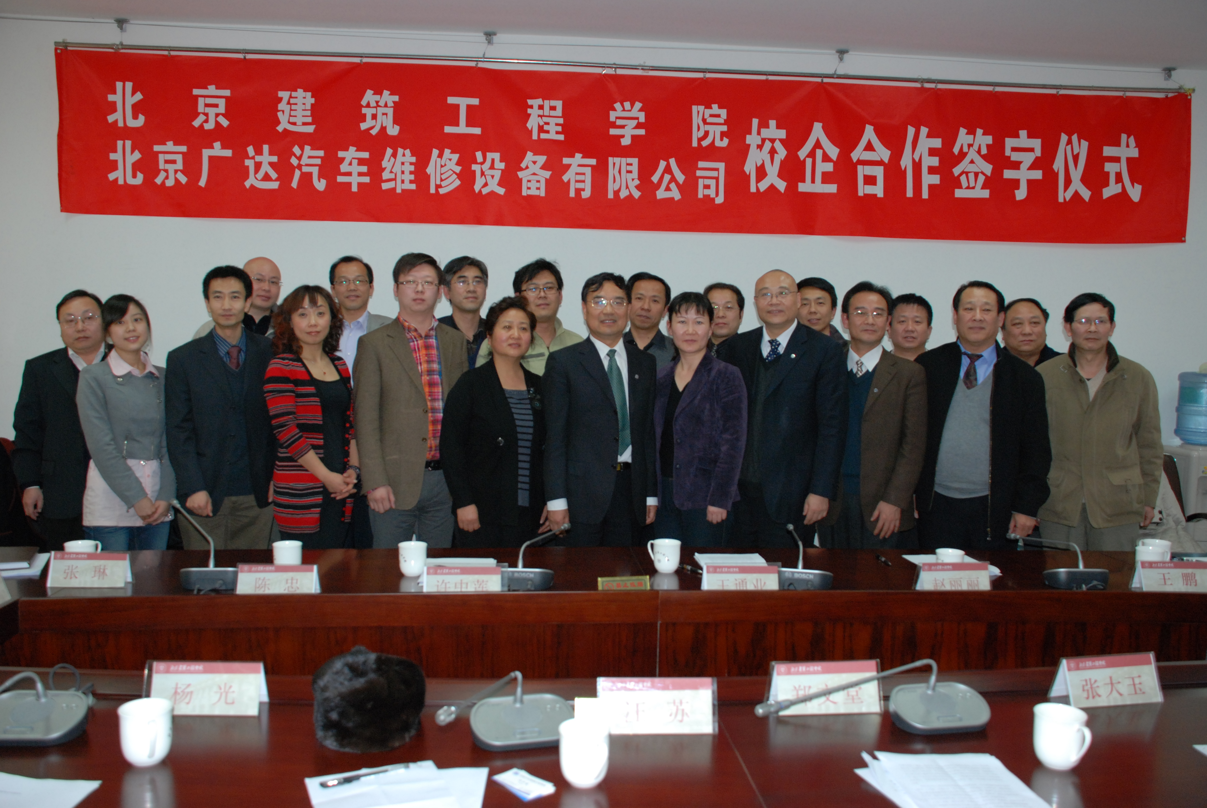 2011年3月3日下午3点,“北京建筑工程学院-北京广达汽车维修设备有限公司校企合作签字仪式议程”在我校第三会议室隆重举行。校长郑文堂、副校长兼机电与汽车工程学院院长汪苏、科技处处长张大玉、学生工作部部长杨光、教务处副处长李雪华、机电与汽车工程学院党总支书记王跃进、机电与汽车工程学院副院长陈宝江等参加了签字仪式。出席仪式的广达领导有广达董事长王通业、总经理王鹏、副总经理陈忠、财务总监渠棣、生产基地厂长张琳、生产基地总工程师高征、总工程师助理李仕明、总经理助理金凤波8位领导。行业领导中国汽车工程学会汽车运用与服务分会秘书长赵丽丽和北京市汽车维修行业协会秘书长许中莲出席了签字仪式。签约仪式由机电与汽车工程学院党总支书记兼副院长王跃进主持。