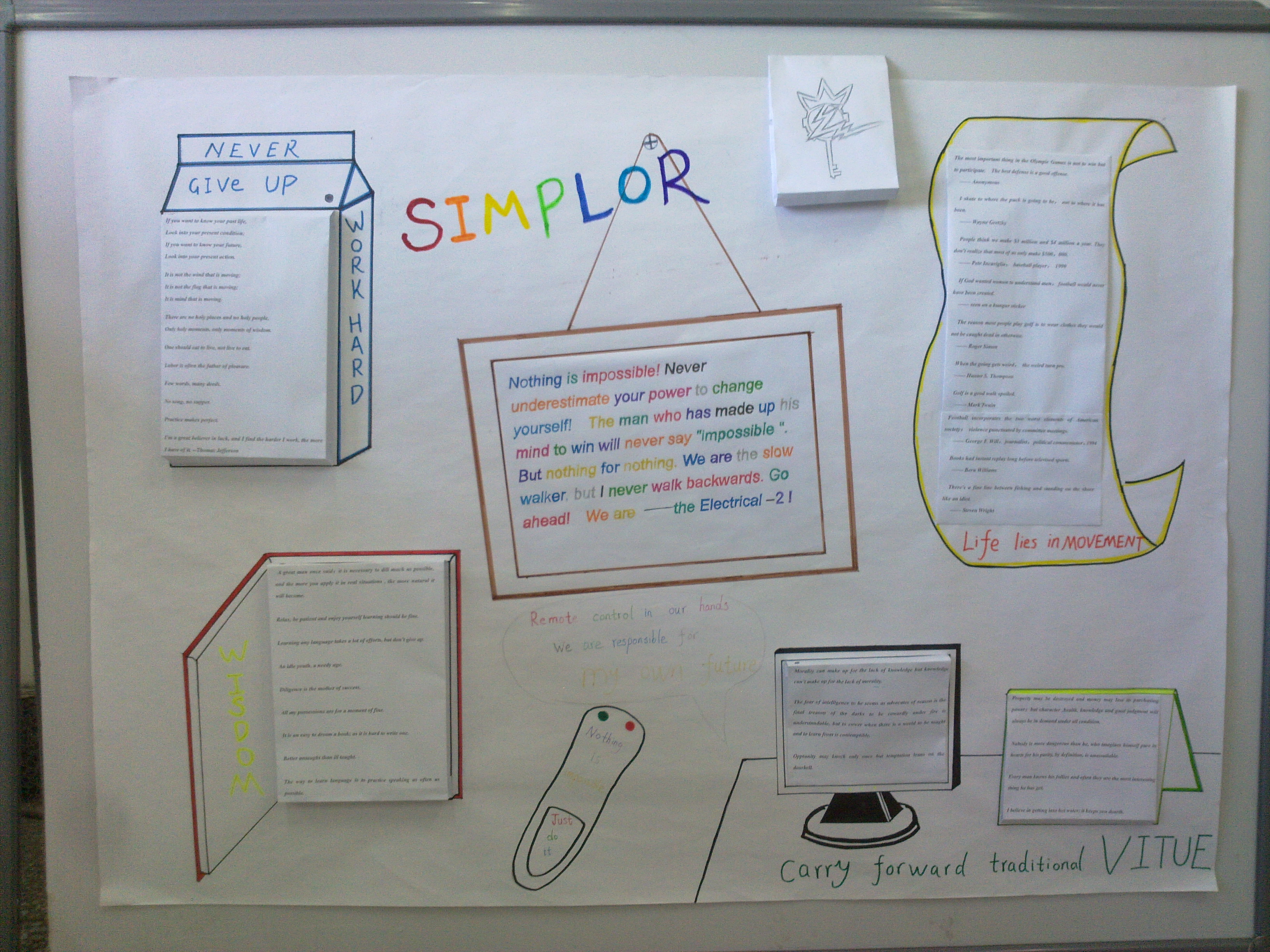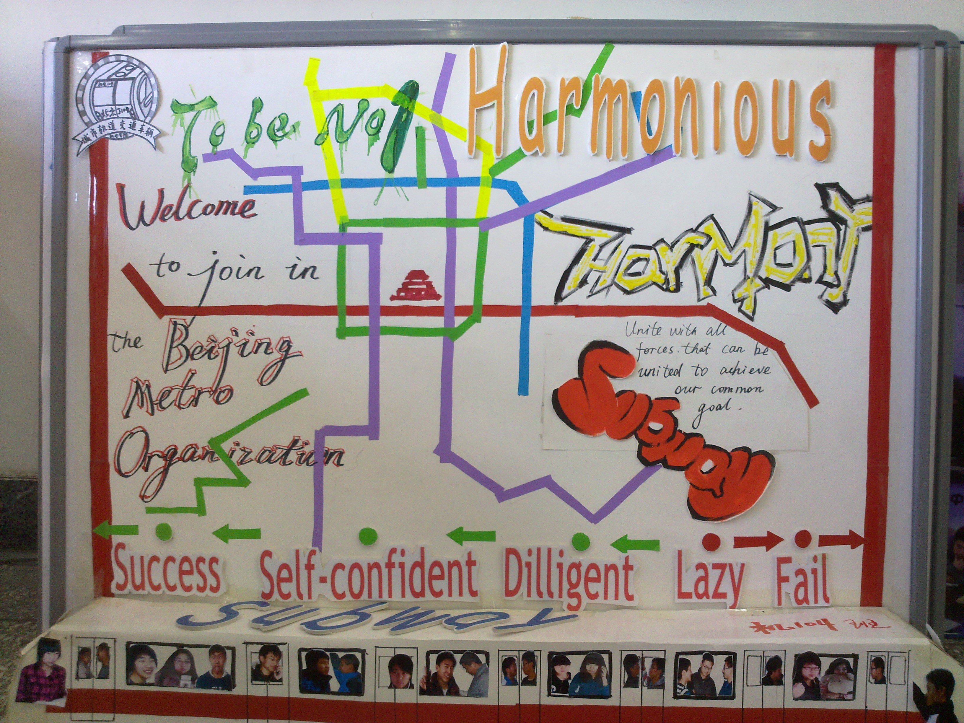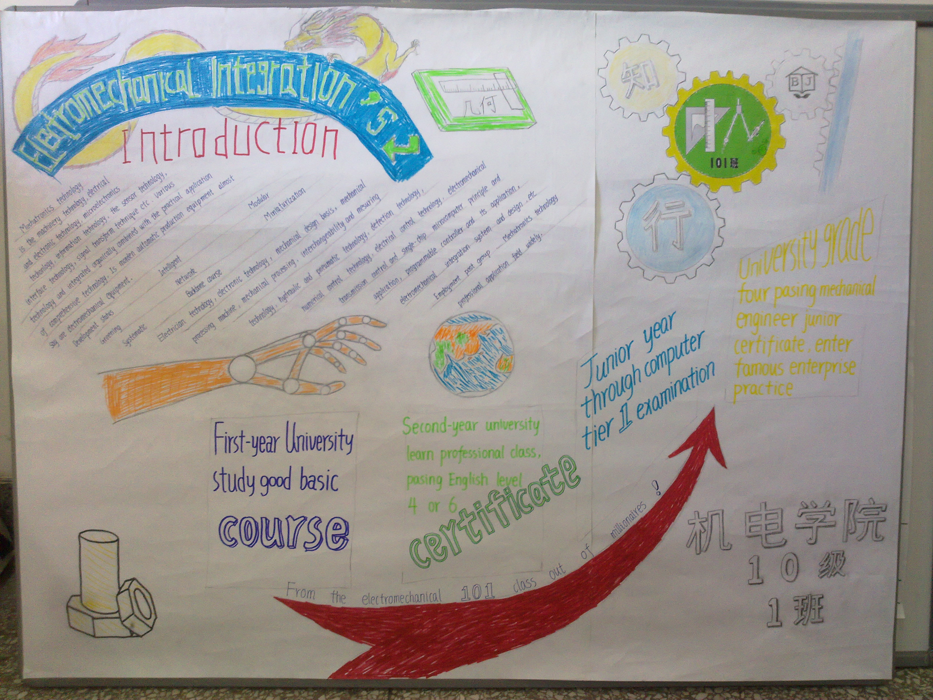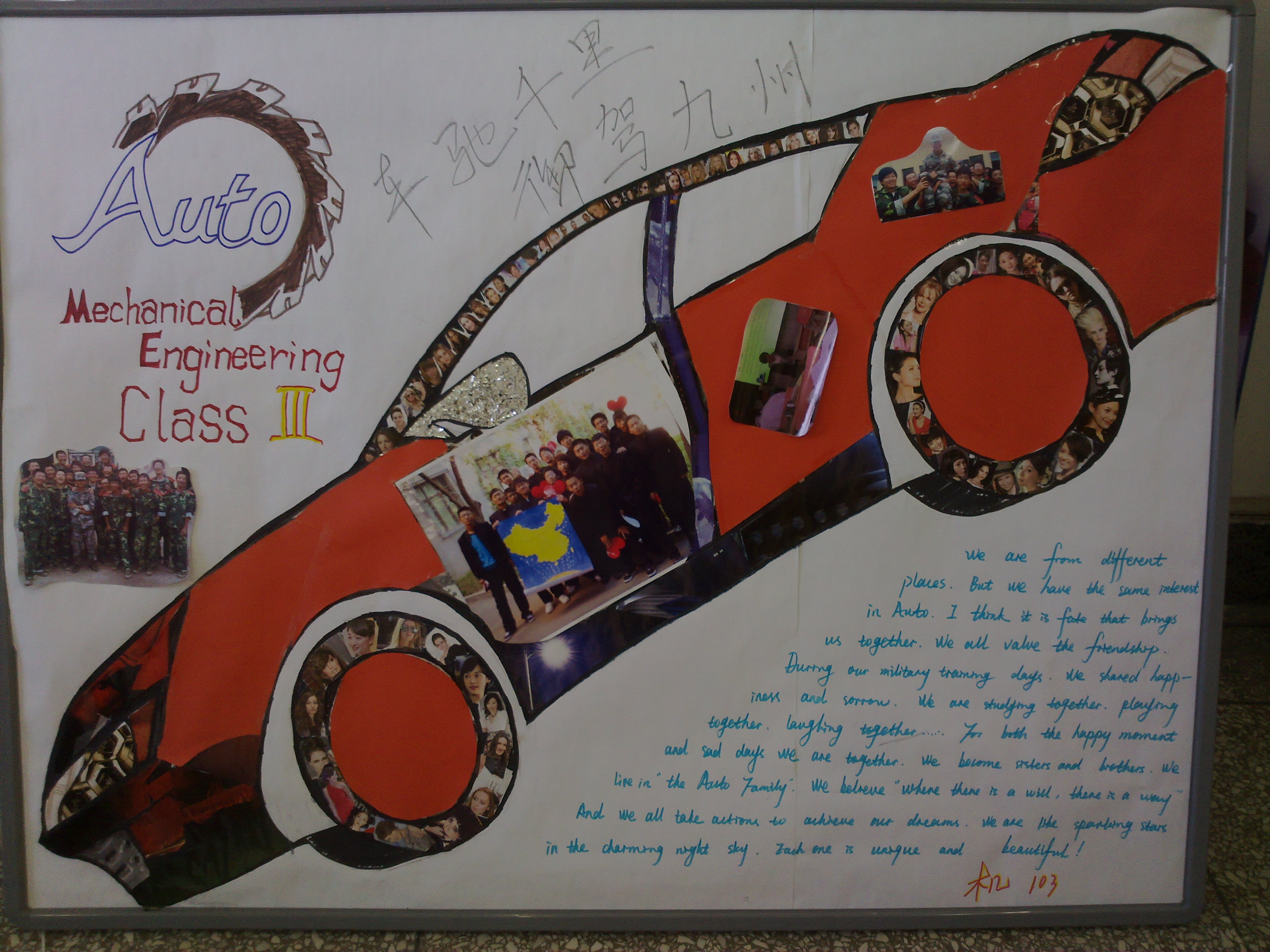 其次各班用英文制作班级文化展示展板,展示各班的班风、学风建设中的措施及各自的班级文化。一班二班围绕机电一体化这个主题制作展板,并且宣传关于机电方面的知识;三班在以汽车为背景展示出自己专业的特色;四班同学则以轨道车辆为醒目的标志来介绍城市轨道交通这个专业以及班风;工业班同学简明扼要的通过展示工业工程之父将自己班级的文化突显出来。