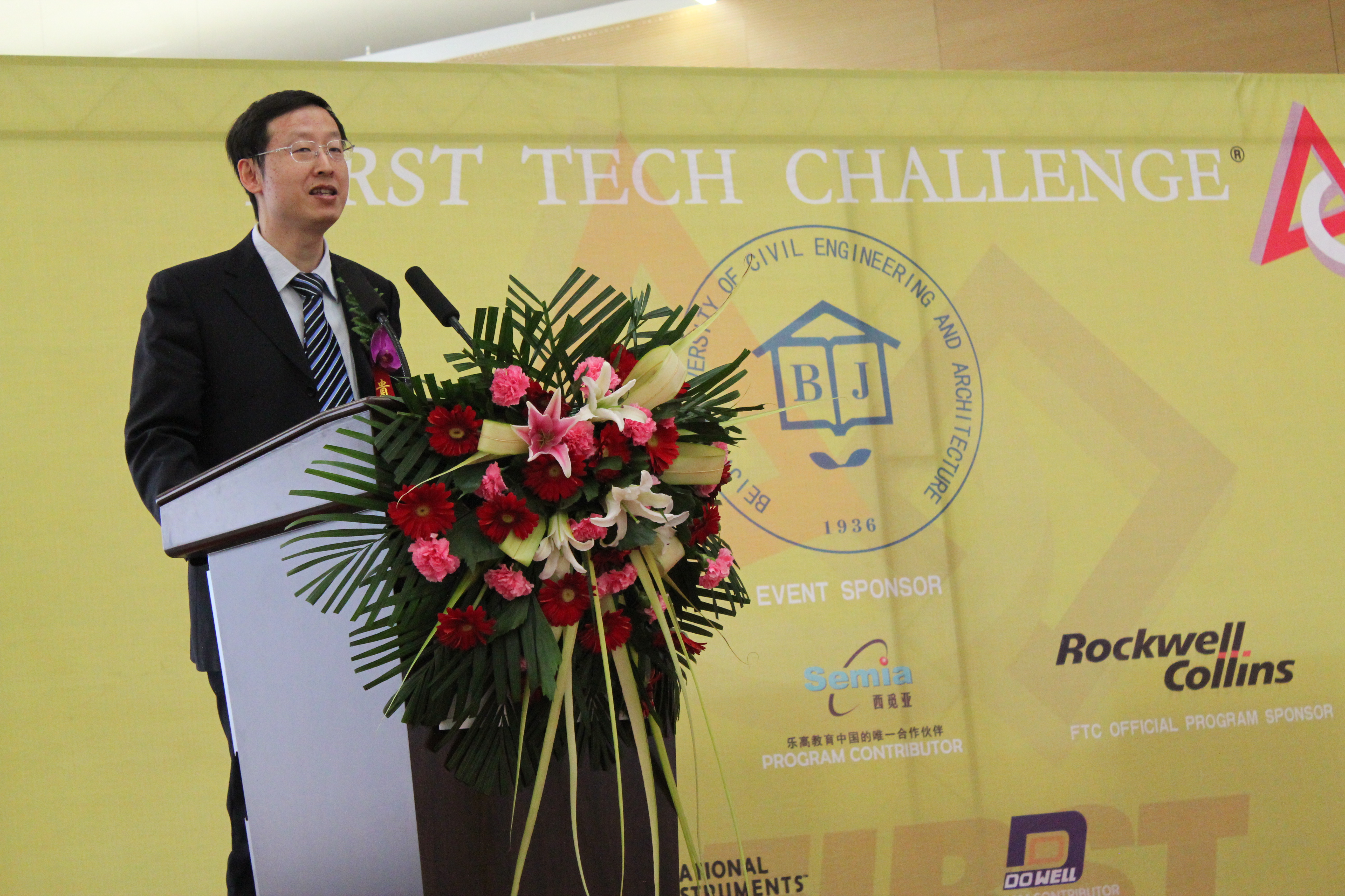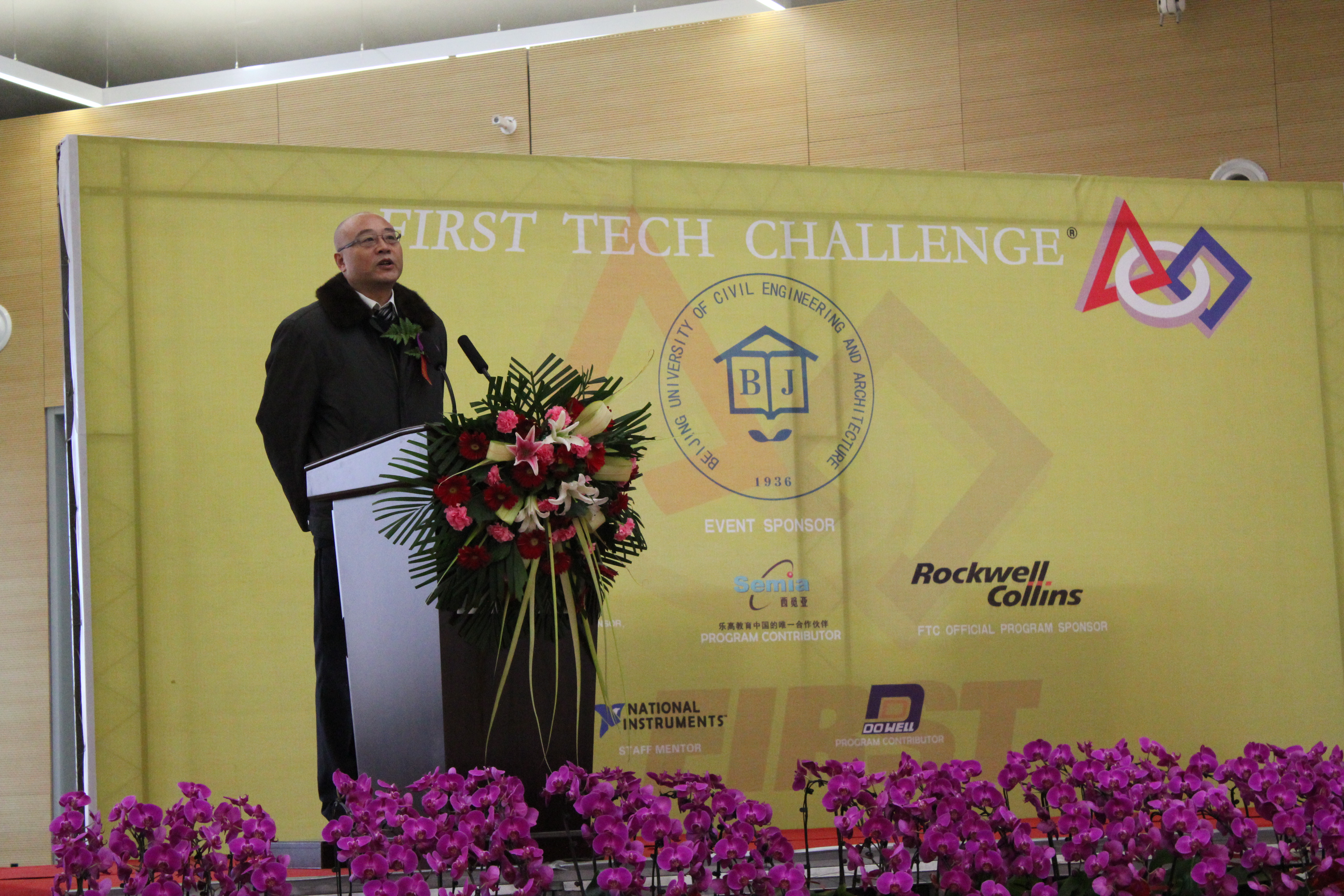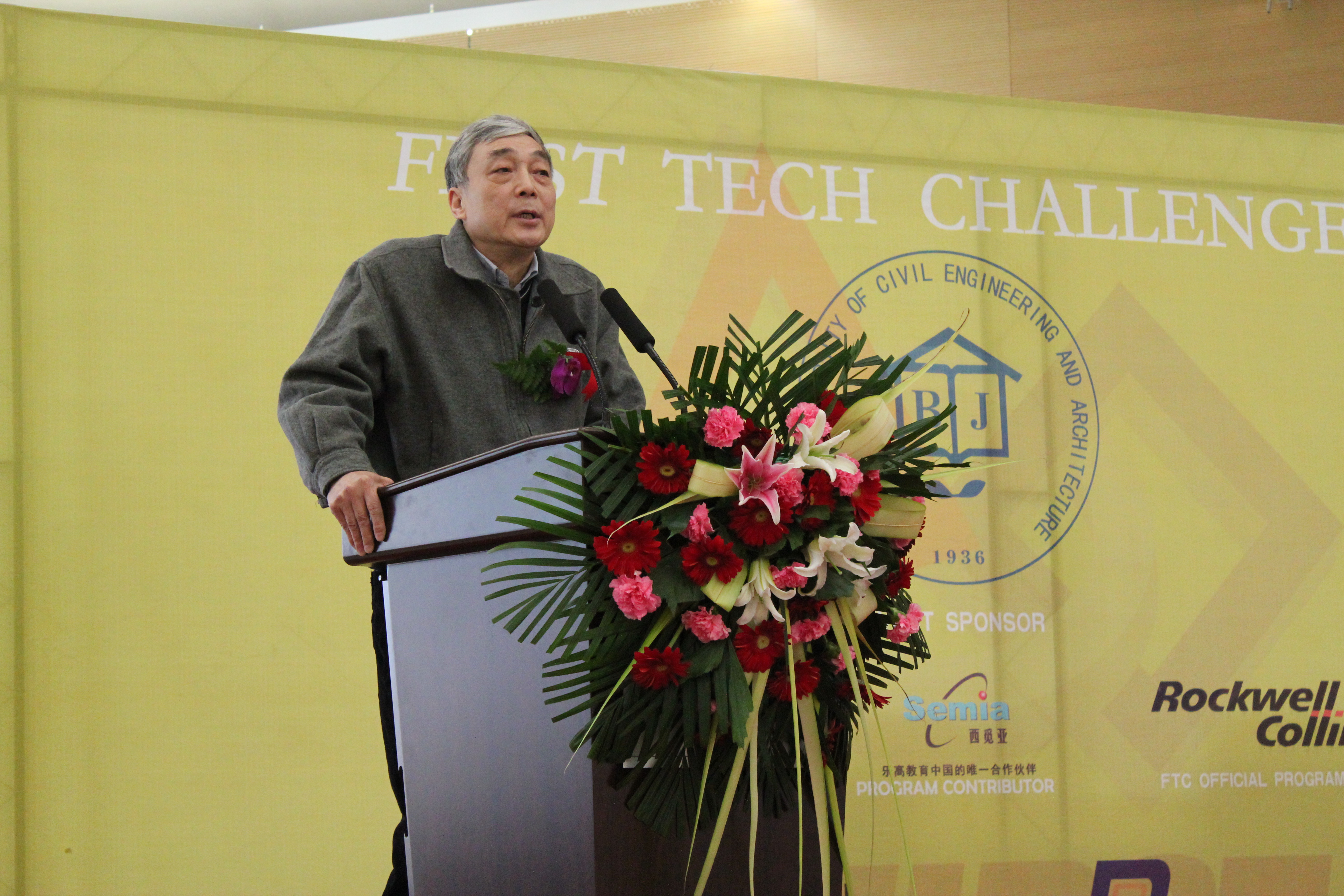 党总支书记王跃进、校团委书记黄尚荣、保卫处副处长毛发虎等领导出席。边群英女士、刘同龙总裁、宗光华教授、彭海涛总监分别在开幕式上致辞。汪校长在致辞中介绍了学校的基本情况,并指出国际上每年都有数十所大学承办FTC及其他FIRST的相关赛事,所以为了延续这一好的传统,我们致力于将优秀的中国高等教育资源以及导师们的经验分享给中学生们,为中学和社会之间搭建一座桥梁,希望更多的学生可以参与到这一赛事中。