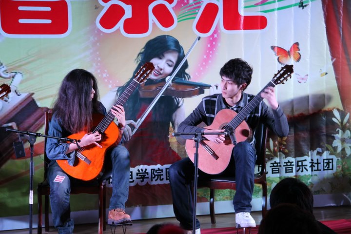 紧接着,来自全校各个学院的同学分民谣组、布鲁斯组、尤克里里组分别奏响了《情非得已》、《有没有人能告诉你》、《卡农》、《同桌的你》等歌曲,以其优美、欢快的旋律将全场500多名观众带入新年的喜庆气氛中来。