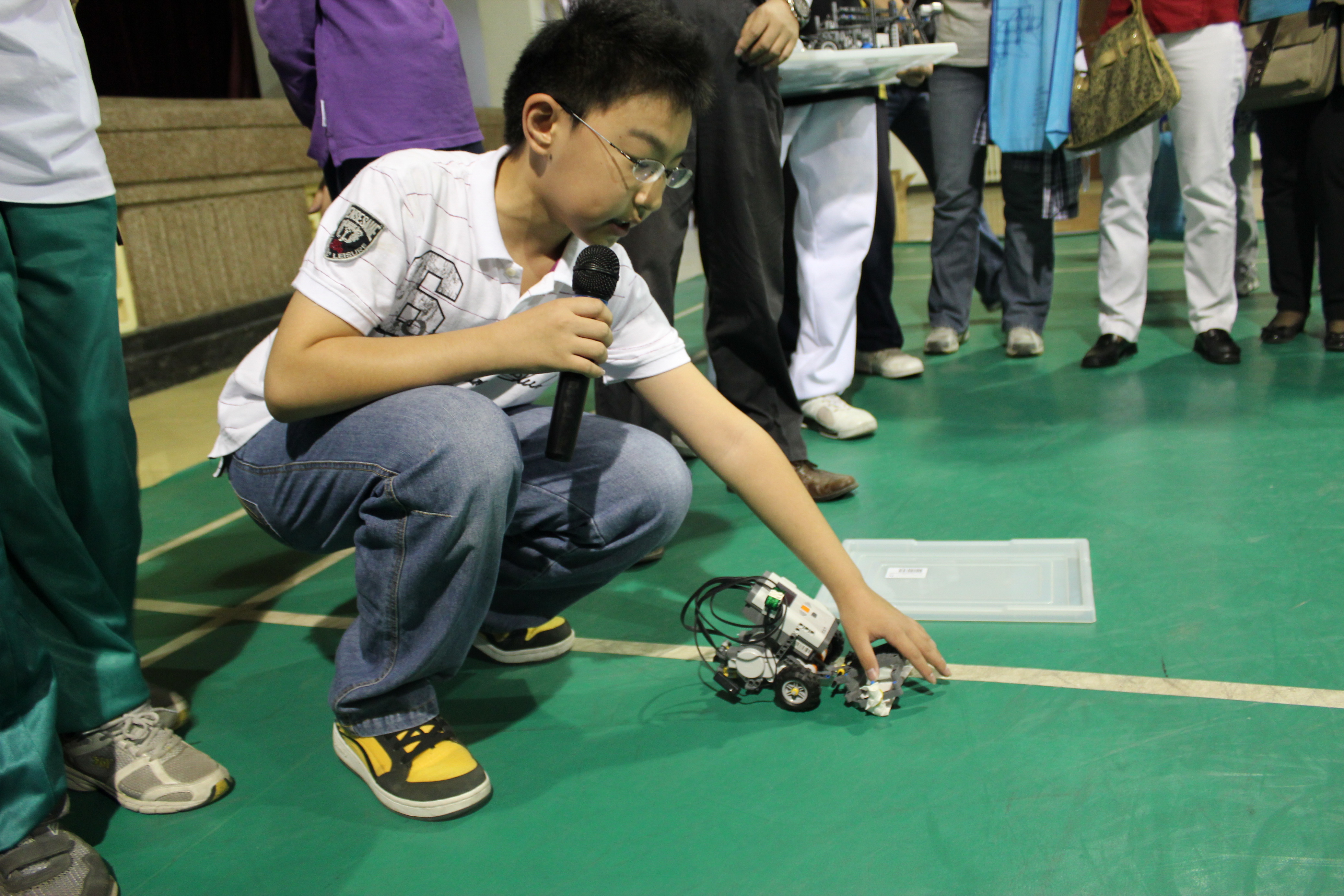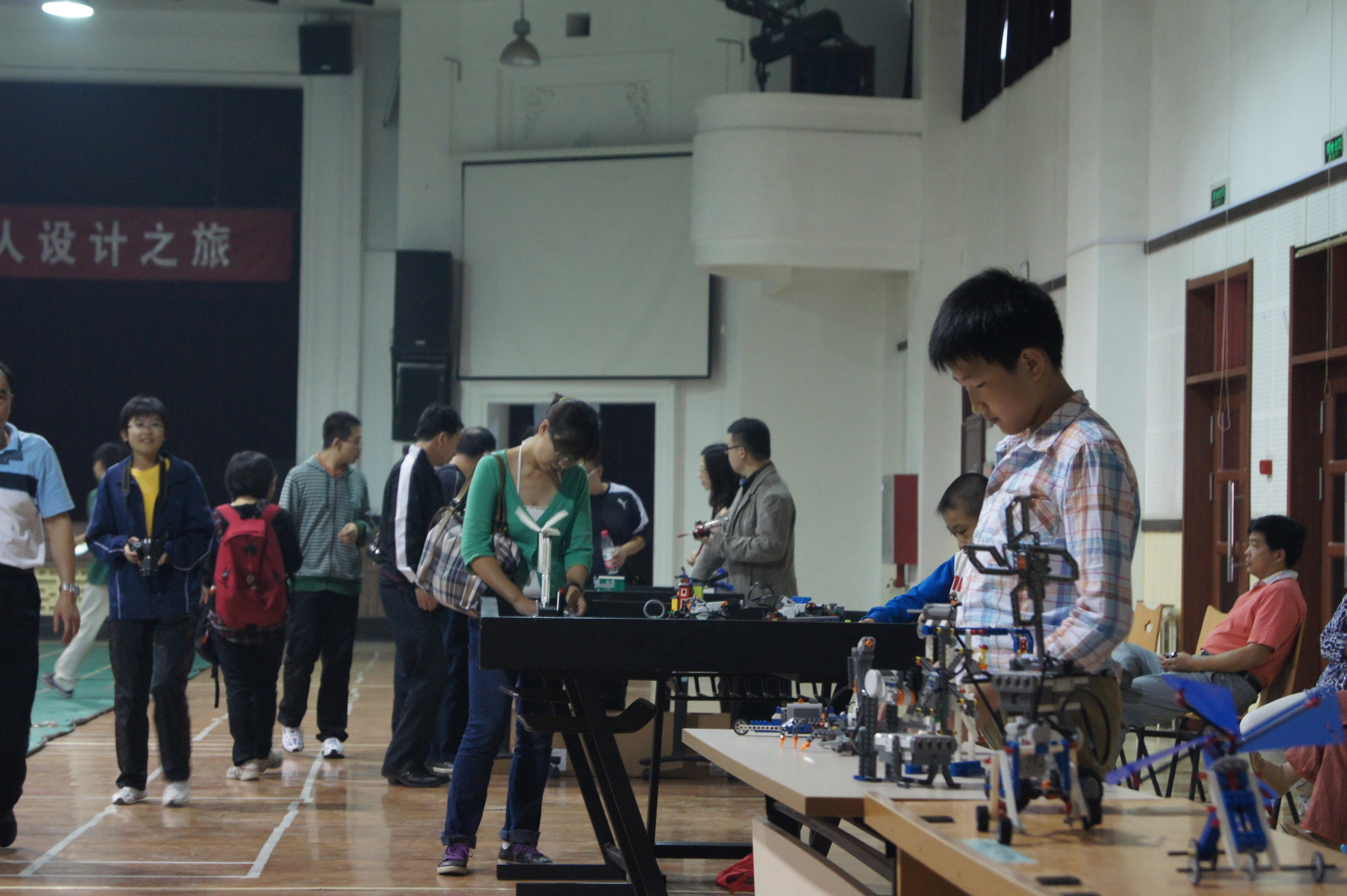 下午在我校大学生活动中心举行了2011北京国际设计周机器人设计之旅活动,与以往他们在学校实验室设计、制作机器人活动不同的是,本次设计机器人的主题全部与家庭有关,与本届国际设计周“设计北京、善意设计”主题相呼应,包括擦地、爬楼梯、擦鞋、倒水等,为了启发孩子们的设计灵感、让孩子们能够拿出科学合理的设计方案,特地邀请了来自美国的Paula Joseph女士、美国PTC公司的Shelly Shen女士还和中国的孩子们一起做了一个小时的头脑风暴活动。随后同学们迅速展开设计,在两个小时的自由搭建时间内各组都拿出了能够运动演示的机器人作品。最后经过乐高工程师的评审,倒水机器人、爬楼梯机器人等四组作品因设计科学、实用且演示效果好等特点获得优秀作品。下午的活动还吸引了很多学生家长以及学龄前儿童的现场关注。
