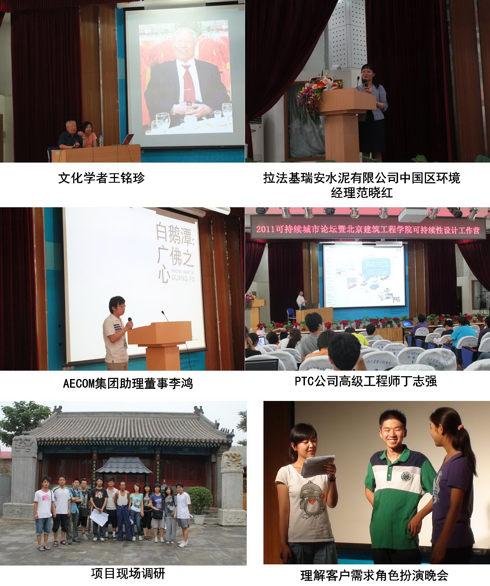 在7月12日—13日上午的2011可持续城市论坛上,北京工业设计促进会专职副理事长、北京工业设计促进中心副主任、2011北京国际设计周项目主管宋慰祖先生做了题为“设计北京、善意设计”的报告、“绿色金属铝合金助力可持续创新设计”、美国安永会计师事务所气候变化与可持续发展部门经理张有为做题为“建筑使用过程碳盘查的方法与项目分享”的报告、威卢克斯中国有限公司设计总监郭成林做题为“威卢克斯欧洲可持续建筑实践MODEL HOME 2020”的报告、我校环能学院院长李德英教授做了“节能建筑专题报告”、拉法基瑞安水泥有限公司中国区环境经理范晓红做了题为“致力于成为中国水泥行业可持续发展的典范”的报告、AECOM助理董事李鸿做了题为“AECOM的可持续城市发展探索”、联合国教科文组织产学合作教席主持人查建中教授做了“产学合作教育” 专题报告、文化学者王铭珍老先生做了“宣南文化”专题报告、PTC公司高级工程师丁志强做了“计算机辅助设计的新纪元”的报告,报告人与同学分享了行业和业界最新的可持续理念和项目实践。