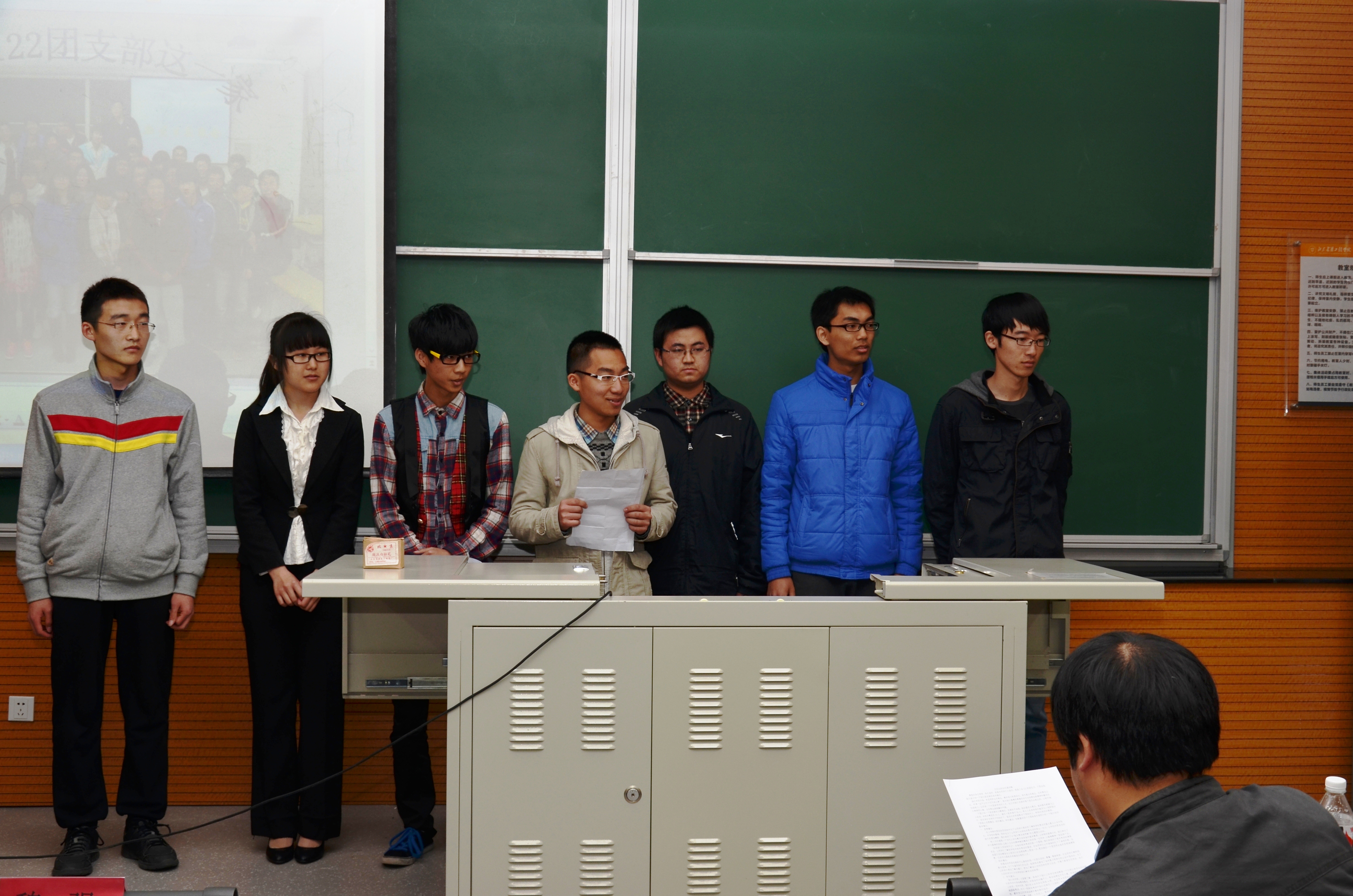 评选大会分两部分举行,团支部现场展示和团支部委员及班委答辩。为了显示评选的公开公平公正,展示及答辩顺序由抽签决定,并由评委老师现场评分,工作人员现场计分。答辩过程中,各团支部各显神通,用精心制作的ppt和团支部委员的演说展现了本支部的风采。有的举行有意义的团日活动,展现了大学生的社会责任感;有的组织丰富多彩的班级活动,促进支部团员的相互了解,增进友谊;有的组织集体的自习,互帮互助,共同成长。