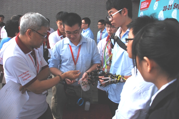 经过前期选拔,共有六支来自东北亚地区高校的优秀参赛队伍参加本次大赛,各大高校的机械设计高手们纷纷拿出绝活,在赛场上展示风采。宁波诺丁汉大学设计的康复带能够为中风病人四肢的康复提供针对性的帮助;中国农业大学设计的作品能在中风患者坐下和站立时给予有力的支撑,是普通拐杖的一个革新;澳门大学设计的“生命之手”能使中风患者的手臂与普通人一样便利;华南理工大学广州学院设计的作品能够有效帮助偏瘫患者避免肌肉萎缩,治疗中风病人的后遗症;北京信息科技大学带来了能够帮助中风病人进食的机器人;我校设计的作品“i Bath”能够帮助中风病人洗澡,极大提高病人的生活质量。在陈述环节,参赛队用精美的ppt、逼真的动画视频向评委展示了设计理念和作品的机械原理;在问答环节,评委老师们专业犀利的提问和同学们沉着精彩的回答相互碰撞出思维的火花,带来了一场科技与智慧的盛宴;在实物展示环节,参赛队向评委演示了实物模型,精美的作品吸引评委和参会人员纷纷驻足观望。