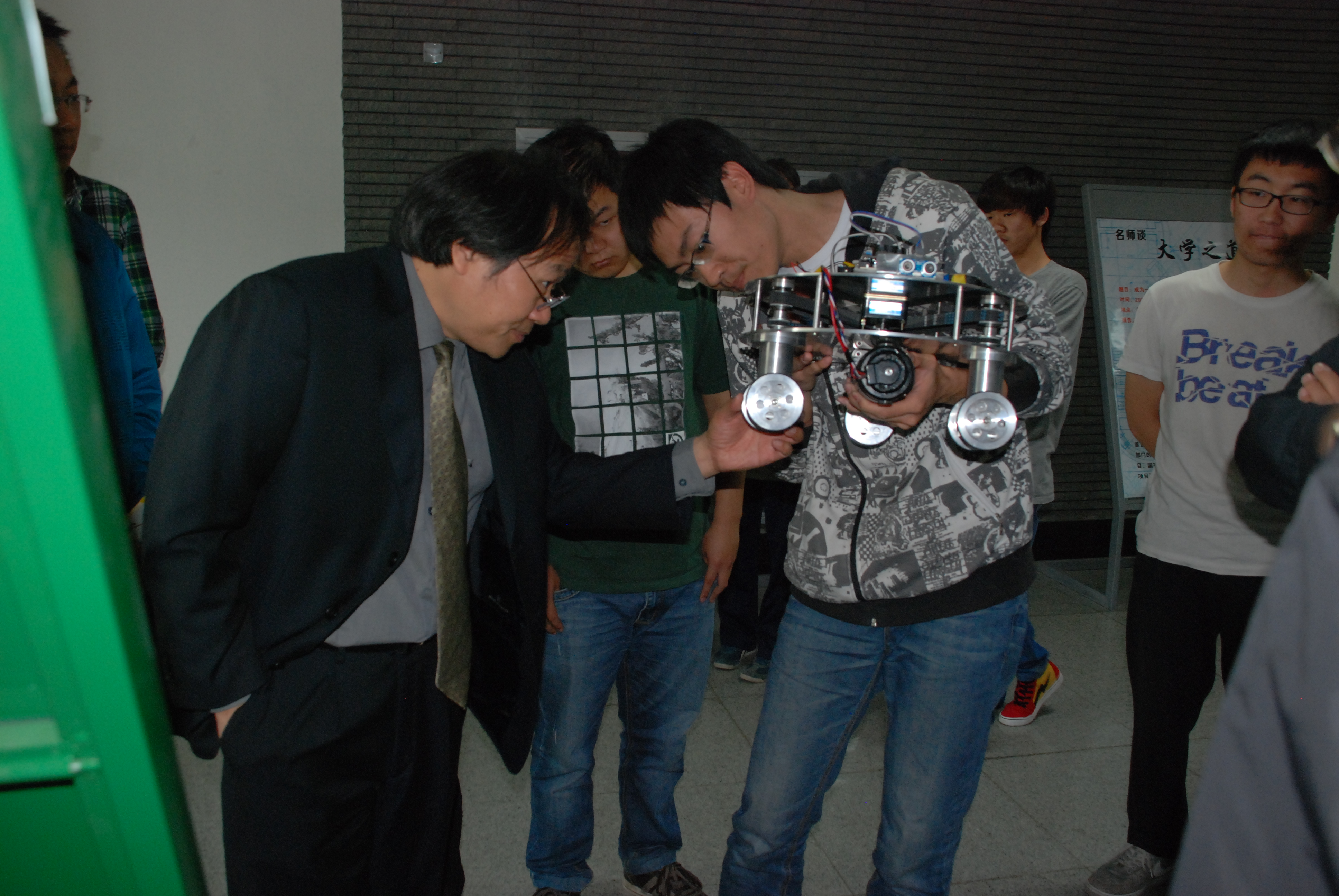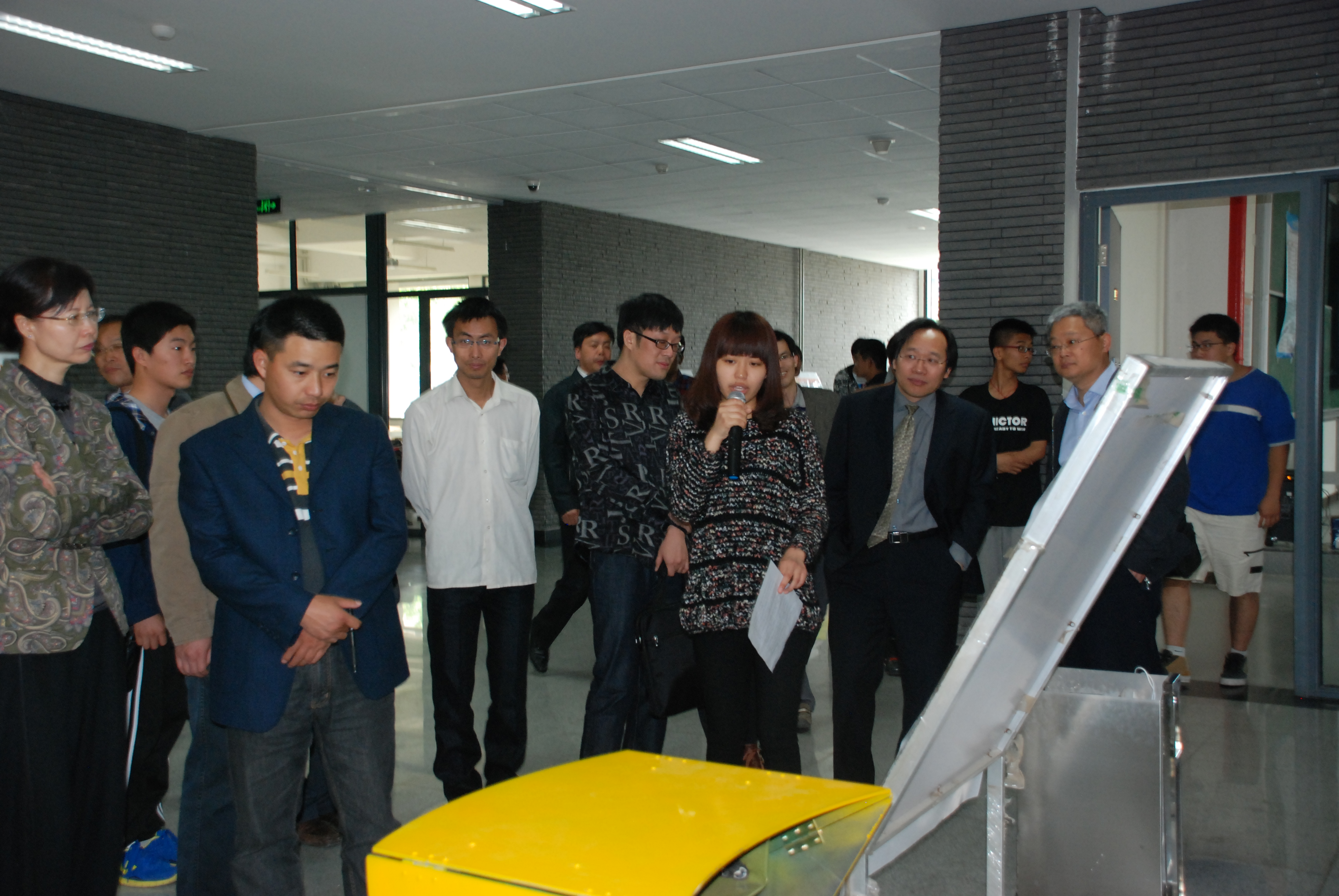 作品展示吸引了很多老师和同学们前来参观。展示现场——基础楼A座走廊里依次摆放了参赛作品介绍资料及实物模型,设计者为前来参观的老师和同学仔细介绍了设计理念和设计原理,并进行了现场演示。走入展示现场,如同来到了一个未来的幻梦课堂:“随心座椅”行走时可以锁定目标实现短距离的无线跟随,帮助携带书本等一些随身用品,行走过程中遇到障碍还能自动绕行躲避;“梦幻课桌”颠覆了传统的矩形设计,充分考虑了舒适度,减少了上课的疲劳感,有效的提高了听课效率;“便携多功能组合式理论力学教具”使理论授课内容具象化,可以边授课边演示,有利于学生对授课内容的理解。每一件展品都凝结着设计者的智慧和心血,让参观者深刻感受到机械创新的魅力,对未来的幻梦课堂充满期待。展示期间,校党委副书记张启鸿、图书馆馆长王锐英、学生工作部部长黄尚荣、团委书记朱静等老师莅临现场参观了展览。
