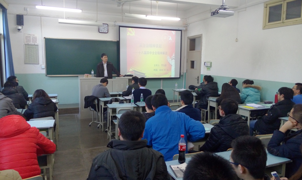李鸿磊老师是首都师范大学研究生院团委书记、党建和思想政治研究办公室主任,曾参与编著过《理论热点面对面》系列丛书,对党的方针政策、理论热点问题有深入的研究,善于将晦涩难懂的政治理论用通俗易懂的语言讲述出来。李老师的报告题目为《从法治精神谈起——十八届四中全会精神解读》,分别从十八届四中全会的主题、法治中国美好愿景的畅想、党大还是法大的争论、德治与法治的思考、核心价值观与我们等五个方面阐述了十八届四中全会的精神。报告期间,李老师用通俗易懂的语言、丰富的案例、有代表意义的影片,对法治精神的内涵进行了详细的阐述、对自觉践行社会主义核心价值观的行为进行了弘扬,号召党员同学们深刻领会四中全会决定的精神实质、准确把握科学内涵,带头践行社会主义核心价值观,弘扬法治精神。