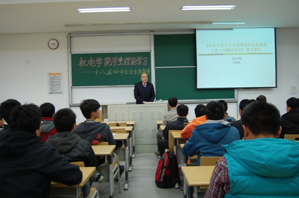 邀请文法学院院长孙希磊教授,为学生党员和入党积极分子做了十八届四中全会精神的专题辅导报告。学院党委书记王跃进、副书记汪长征、本科生第二党支部书记曾祥渭参加报告会。