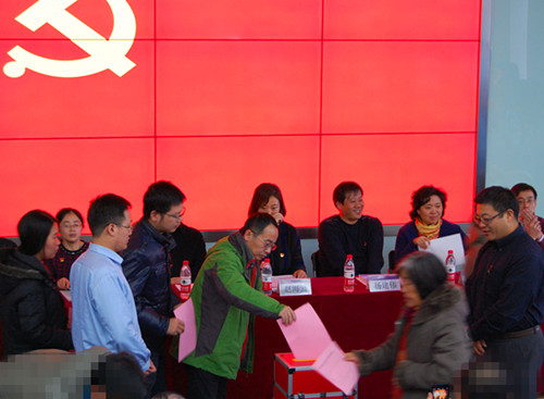 在工作人员的引导下,与会有选举权的党员认真填写选票,并投出神圣的一票。