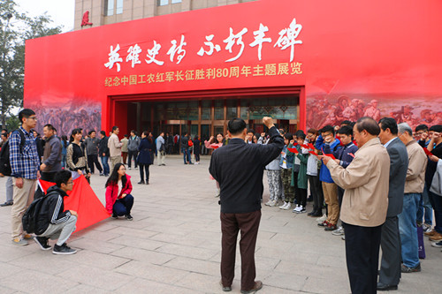 主题展览共分“战略转移踏征程”、“伟大转折定航向”、“浴血奋战勇向前”、“革命理想高于天”、“胜利会师开新局”、“不忘初心走好新的长征路”等6个部分,运用大量高科技手段,通过展示相关画作、浮雕、历史文物,真实地还原了长征情景。参观中,师生时而驻足聆听,时而低头沉思。看着革命先烈们用过的步枪、穿过的已经褪色发黄的衣服,听着讲解员讲述红军长征路上的故事,崇敬之情油然而生。党员们对长征有了更多直观的理解,感受到了这次伟大远征在精神和意志上的强大鼓舞。参观完展览后,两个支部的党员们一同在军博前重温入党誓词,并时刻提醒自己不忘初心,履行党员职责和义务。