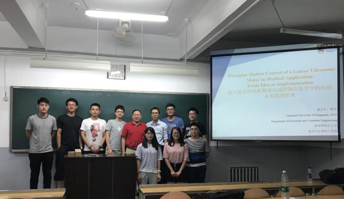 邀请新加坡国立大学研究员梁文宇博士做了关于“超声波直线电机精密运动控制及在医学中的应用:从构思到实现”的学术讲座,梁文宇博士从工程问题的提出、到设计思路、再到问题的解决等几个方面,用研究生能懂的语言系统介绍了超声波直线电机与医学的结合及其工作过程和工作原理。