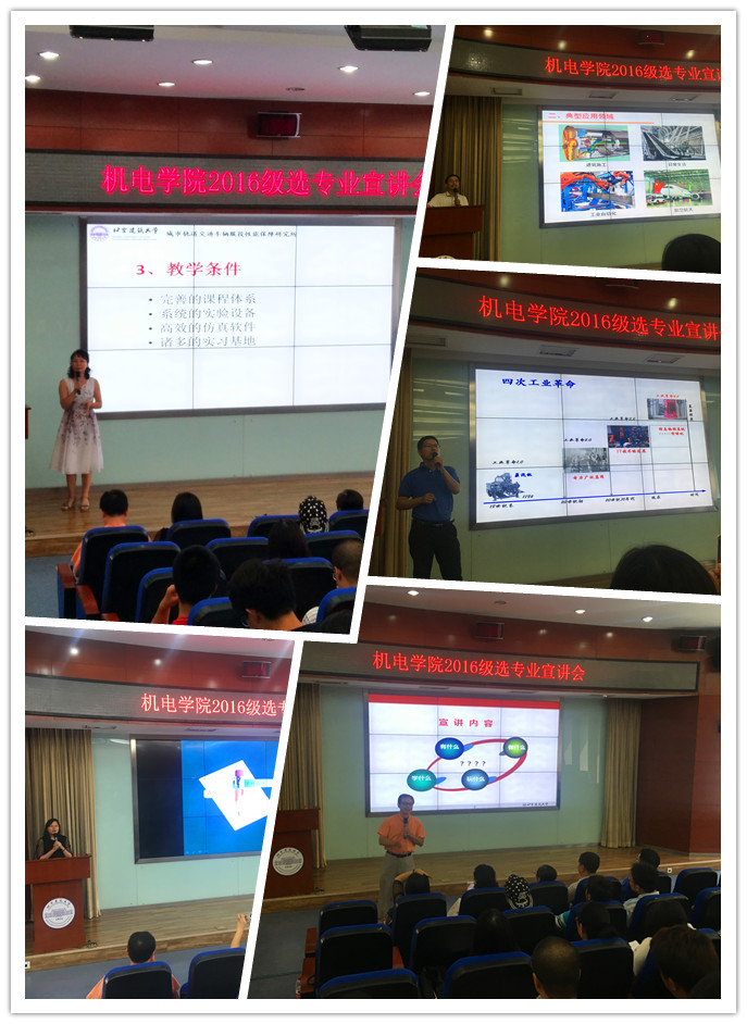 张军从专业选择的基本原则与申请程序上进行了详细说明。机械工程系袁美霞、机械电子工程系陈志刚、工业工程系王传涛、车辆工程系(汽车工程方向)周庆辉、车辆工程系(城市轨道交通方向)周素霞分别对五个专业方向进行了宣讲,图文并茂的介绍了各个专业的师资状况、科研实力、学生培养、就业工作等情况。