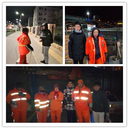 为他们送上一杯热奶茶,这微不足道的关心代表的是一份温暖,满载着对他们的感激与尊敬;为他们送上一块面包,看似简单,却寄托了对他们的关注与关心,是志愿者们真真切切的关怀;为他们送上一盒八宝粥,食物无情人有情,每粒糯米都包含着志愿者们的爱心。每见到一位环卫工,志愿者们都不忘道一声:“您辛苦了,新年快乐。”在感受他们辛苦的同时,表达一份敬意,让城市的守护者、美容师感到社会大家庭的温暖。