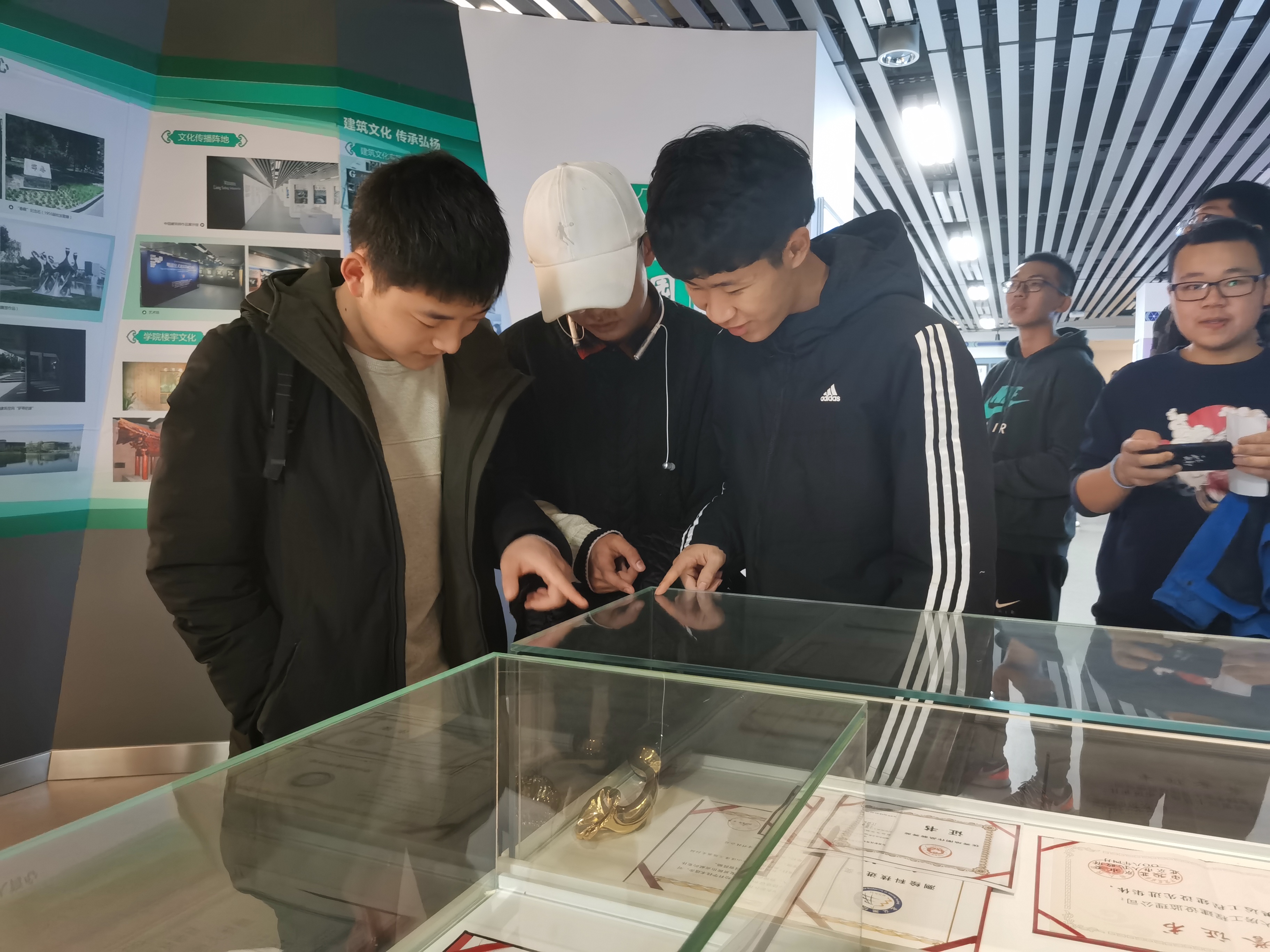 第二部分为发展成就展。一代代建大人奋勇拼搏的印证被小心翼翼地收录在透明展柜里,像极了一颗颗珍珠,在历史长河反复打磨下光辉熠熠。学生们不禁驻足停留,端详着前辈们的光辉成果。建大精神于此传承。