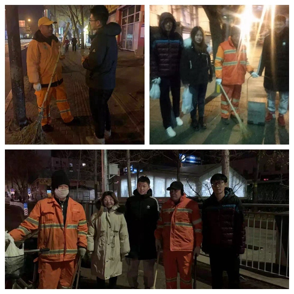 开展了慰问环卫工人活动。凌晨五点,十一位同学抵达黄村西大街地铁口,环卫工们已经开始工作。表明来意后同学们拿着准备好的点心与热粥送给街道黄玫瑰们,叔叔阿姨十分开心,纷纷表示这是一份惊喜的礼物。在聊天过程中同学们得知,他们早上五点上班,直到晚上五点才下班,在此期间,只留出一点吃饭的时间,没有专门休息时间。看着叔叔阿姨们推着垃圾车,拿着扫把在街道上清理着垃圾,同学们都非常感动,更加理解到环卫工人的辛苦,同时对他们默默无私的奉献表示由衷的敬佩。