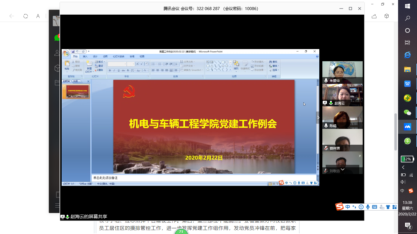 然后,对近期党建重点工作进行总结和交流。各支部汇报了近期开展的“亮身份、践初心、担使命”主题党日活动情况,并结合当前在线教学和学生面临的实际困难,对教工党支部和学生党支部“一对一”帮扶的具体举措进行了深入研讨。赵海云强调,当前各支部要继续以疫情防控为重中之重,要通过“学习强国”等平台深入学习中央的指示精神,为坚决打赢疫情阻击战积极贡献各支部的力量;目前正值做好在线教育教学的重要节点,各支部要将防疫和教育教学两手一起抓,要充分发挥党支部的战斗堡垒作用和党员的带头作用,主动了解学生的困难和需求,制定实实在在的帮扶措施,确保各项工作平稳有序进行。