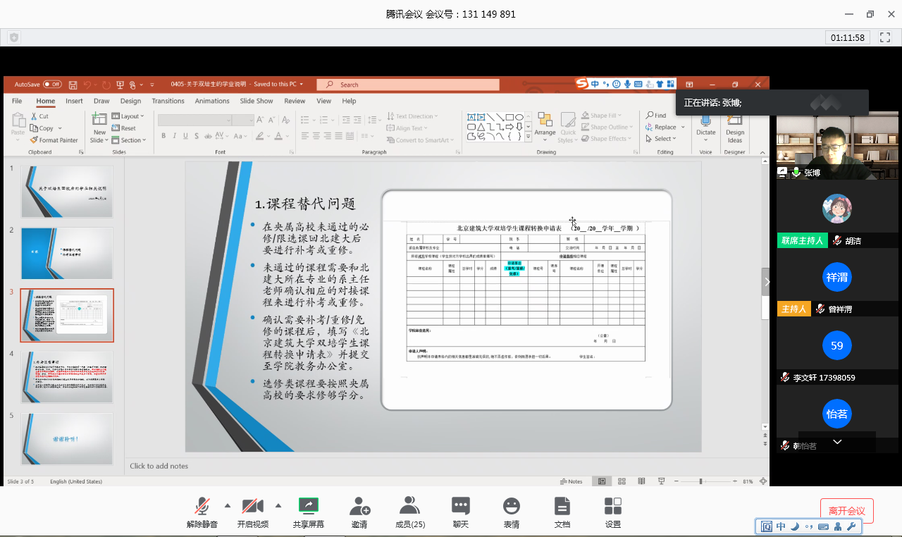 杨建伟院长结合学院前期摸底掌握的双培学生的绩点、不及格课程和考研、出国、就业意向等信息,从学位证、毕业证的获取条件,考研形势与当前应做的准备,出国的准备,未来的就业形势等几个方面,向同学们进行深入分析和悉心指导,嘱咐同学们在当前特殊形势下,不论今后如何发展,都要静下心来,增强自控力,趁早努力,尽早动手,为后期取得丰收打下坚实基础,并向同学们宣讲了学校当前的疫情防控政策,对学生们进行了关怀与慰问。张博老师向同学们讲解了结束双培返回母校后课程替代、不及格课程补考等事项。胡洁老师对同学们进行了就业动员,讲解了学校秋招和春招的大致安排,将就业中的重点事项为同学进行了梳理。几位老师对双培同学进行了“1对1”精准帮扶,并提醒大家劳逸结合,做到疫情防控和学业学习两不误。