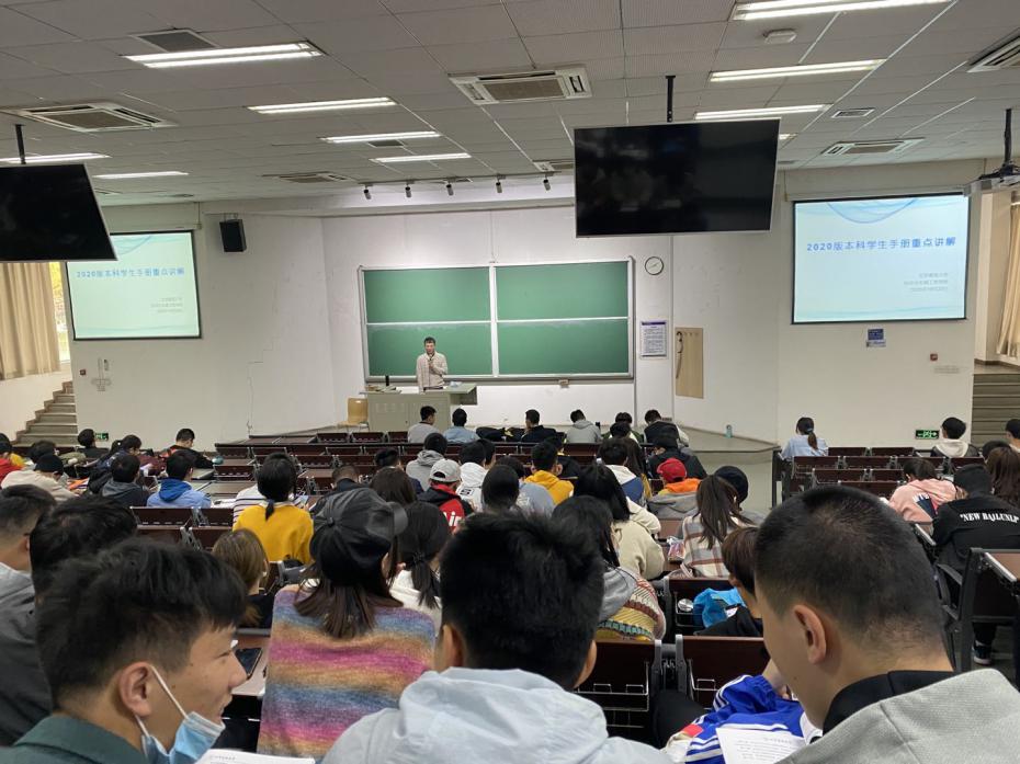 10月13日,新生辅导员高静为2020级学生、2018级专升本学生解读学生手册奖惩贷助部分内容,明确奖励机制、树立规则意识;10月20日,教务员张博针对学籍管理、培养方案等内容进行解读,帮助新生了解课程设置,适应大学管理模式。