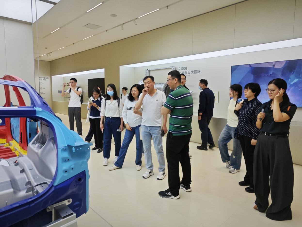 在工厂讲解员的引导下,师生们按照分组有序参观了小米汽车展厅和su7汽车智能生产车间,了解到小米汽车工厂里每隔76秒就有一台汽车诞生,9100吨的超大压铸机群,从液体金属到一块一体压铸后地板只需100秒左右,压铸后铸件会被送去AI质检,速度比人工快数十倍,X光下每84秒28张照片,其准确率达99.99%以上。汽车生产车间员工仅150人,实现了100%自动化,是真正的“熄灯车间”。
