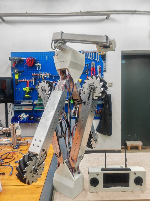基于第一代管道机器人,团队进一步开发了反交叉双V型管道机器人,采用V型反交叉结构设计,并能够实现每个车轮独立驱动且具备螺旋行进能力,并联式活动式连接使机器人拥有较强驱动力、转向能力的同时,具备较大的管径自适应性,并拥有越障等环境自适应性,使管道机器人的综合性能得到较大的提升,可以适用于复杂的多种尺寸多种用途多种环境下的管路系统的多种工作,有效的提高效率并代替人工完成管网日常维护与检修工作。该机器人所采用的创新设计与技术已授权两项发明专利。
