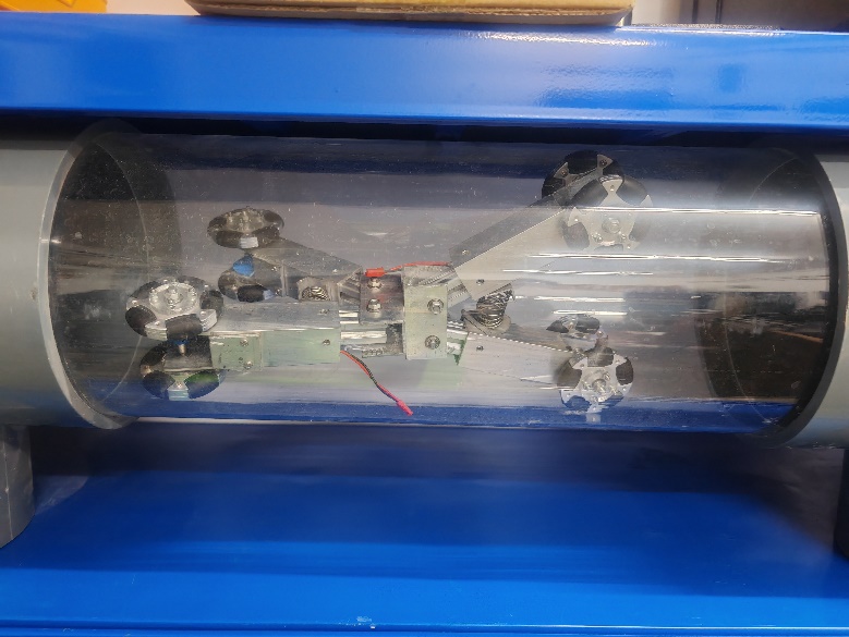 此次展会中,王衍学教授团队主要推出了一种双V型管道机器人和油液磨粒监测系统。该型管道机器人采用可变径设计,具有较好的自适应性;机器人采用四轮独立驱动,弹簧支撑手臂,使机器人具备垂直上升和下降的能力;采用新型轮式设计,使机器人具备螺旋前进的能力,结合压缩变径设计,可顺利通过管道弯道。该型机器人通过方案设计、三维建模以及实物样机调试,在实际管道环境下验证方案的可行性。设计方案成本低,原理简单,通用性较好,是一种可普遍应用于小型、中型及大型管道的内部维护的机器人平台。