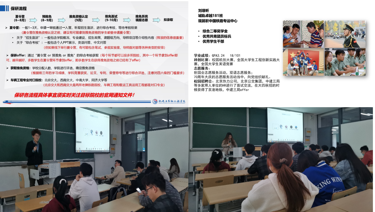 2022届城轨专业毕业生苏宁成功保研至北京交通大学,他分享了在本科期间的学业和科研情况,介绍了保研的条件和流程、大学阶段保研的重要时间节点和相关政策;2022届城轨专业毕业生刘璟昕现就职中国铁路专运中心,他和同学们分享了本科阶段求职面试的经验和技巧,提醒同学们趁早做好未来规划,并着手准备提升综合素质;城轨卓越202的刘昊翾向同学们讲解了大学科创竞赛方面的经验和方法,开拓了同学们参与科研竞赛的思路。机研221的向厚雪以本校考研前期准备和城轨专业的科研前沿方向做了系统的介绍,并就本科毕业后去向的衡量提供了建议。