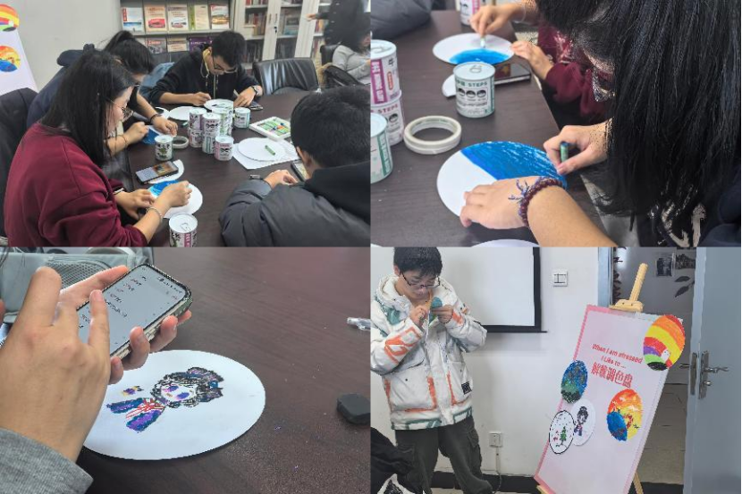 活动中,大家你一言我一语地讨论着,尽情挥洒手中的色彩和颜料,携手踏上艺术解压之路。辅导员万璟瑶、傅景泉与同学们一起交流,耐心倾听并给予指导,帮助他们更好地表达内心感受。随着时间的推移,解忧调色盘上贴满了五彩缤纷的画纸,同学们用青春洋溢的笔调展现了属于青年大学生的活力。