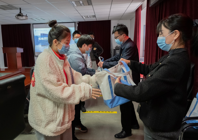 与会老师为志愿者发放冬奥礼包。