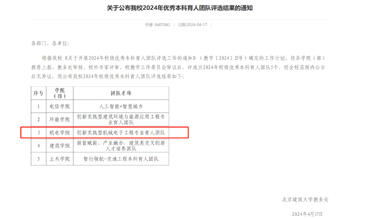 近日,学校下发了《关于公布我校2024年优秀本科育人团队评选结果的通知》(教字〔2024〕63号),亚色网 创新实践型机械电子工程专业育人团队获评2024年校级优秀本科育人团队。