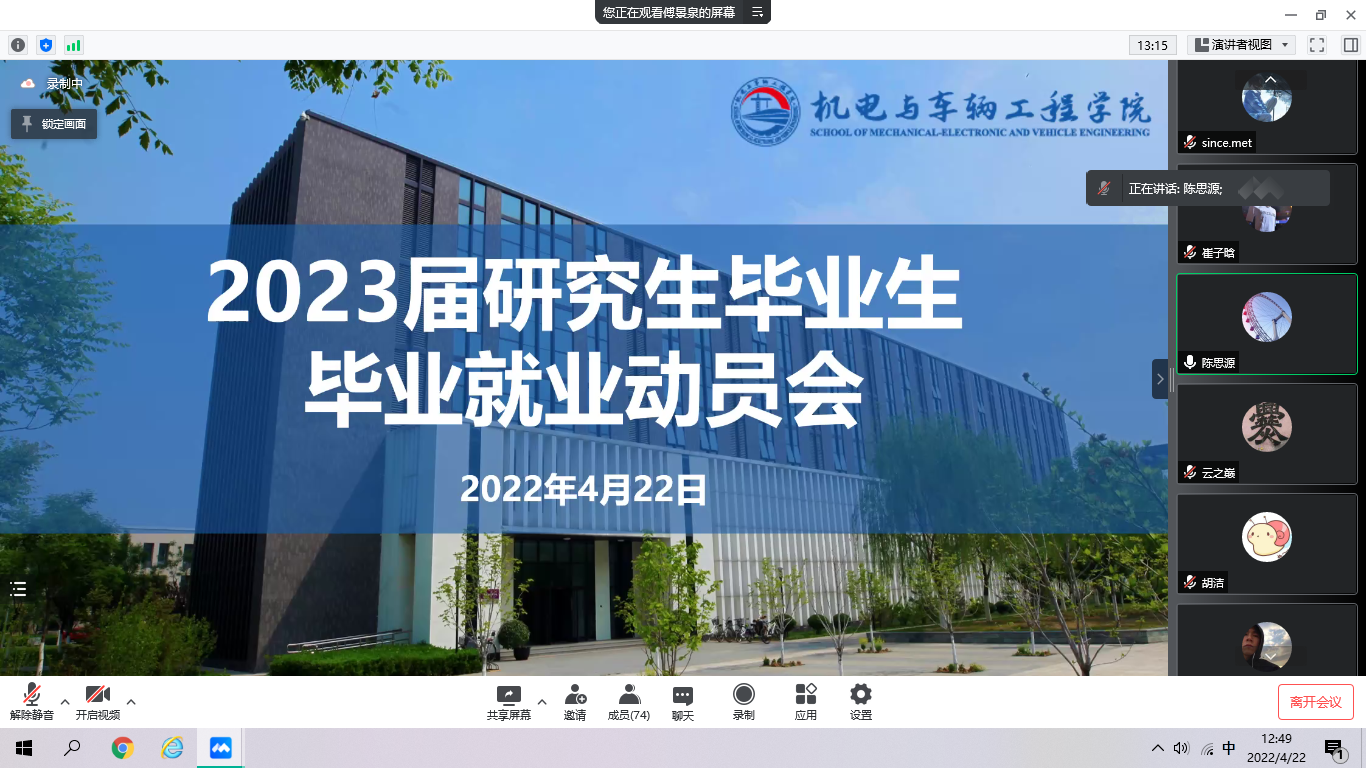 王衍学院长对2022届毕业生目前毕业情况进行简要介绍,在研究生阶段的学术科研、论文撰写等方面提出意见建议。他指出,当前同学们一定要高度重视毕业就业工作,积极主动与导师沟通,把握好时间节点,以高质量科研成果为目标,提前做好毕业就业准备。