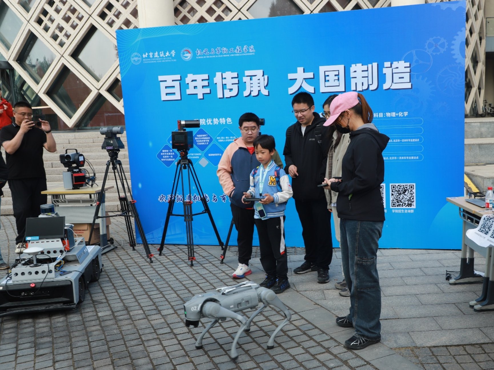 在开放日活动中,亚色网 在学院楼前展示了温差车、智能物流搬运车、垃圾分类小车、餐饮机器人和智能巡检小车等,还特别开放了学院楼C座的机器人工程实验室和机电创新设计开放实验室,让考生和家长能够深入了解学院的专业环境。在实验室里,考生和家长在专业教师的指导与介绍下,近距离接触各类机电设备,增加了他们对机电领域的理解。教师们耐心解答考生的疑问,介绍学院的专业特色和发展方向,帮助学生对未来的学习和职业有更清晰的认识。此外,学院楼前还展示了,优秀集体及学生,树立榜样效应,吸引优质生源。