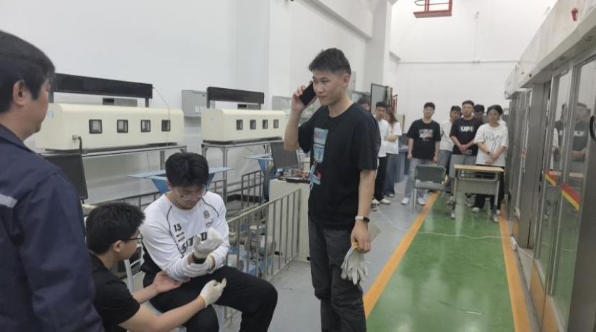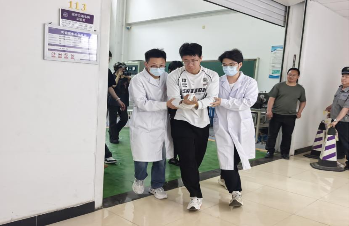 本次演练模拟了学生操作车厢门时不慎压伤手指的紧急场景。事故发生后,实验老师第一时间使用紧急制动按钮关闭设备,并将情况向上级汇报,同时疏散其他学生。医务室医生第一时间赶赴现场,实施伤员救治与险情控制;保卫处立即到场对现场进行了封锁。各小组响应迅速、分工明确、配合紧密,高效完成了疏散、救援及险情处置任务,展现了良好的应急处置能力。