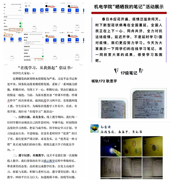 亚色网 按照学校的部署和要求制定了具体实施方案,为线上教学工作做了充分准备。任课教师主动适应线上教学特点,认真制定教学方案、讨论教学方法、积极参加在线培训和教学测试,确保教学质量不降低。学生党员在课程中主动亮明身份,承诺带头上好每堂课,积极为老师和同学做好沟通和服务;学生骨干发出“在线学习,从我做起”倡议书,承诺做到自律自强、互帮互助;同学们积极参与校院两级的居家战疫读书分享活动,让好读书、读好书成为一种风尚;学生会学习部主办了“晒晒我的笔记”活动,展现了机电学子的学习热情,同时继续推出“学霸小课堂”,通过视频给同学们答疑解惑。