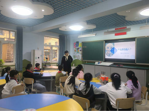来自机器人工程系的机研222班谢子健同学带来了自己的科研作品“机器狗”,向同学们介绍了什么是机器人,现实中的机器人都有哪些,并现场演示机器狗的运动功能和自平衡功能。小同学们非常感兴趣,围成一圈尝试操作,并踊跃提问。有小同学问到:“做这样一只机器狗,编程需要编多久?”谢子健非常详细地解答了同学们的提问。