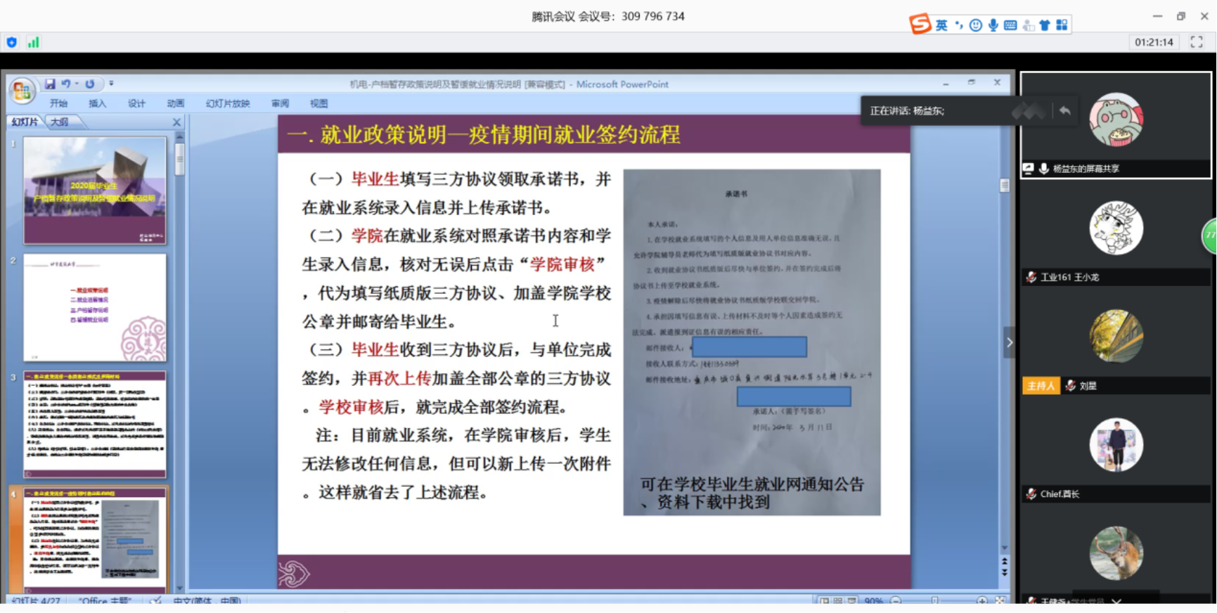 学校就业指导中心杨益东围绕学校就业政策、就业进展情况、户档暂存说明、暂缓就业说明等相关问题进行了详细讲解。