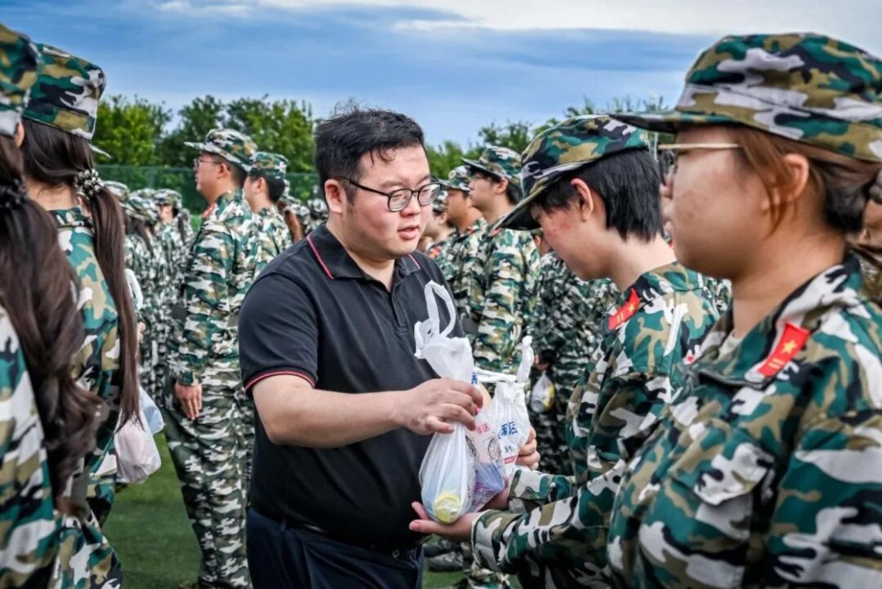 活动最后,学院为新生们准备了丰富的慰问品,包括清凉饮品、面包等,三位老师亲手将慰问品送到学生手中,并关切地询问大家的饮食起居和身体适应状况:"训练强度能不能适应?""晚上休息好吗?"一句句贴心问候,让远离家乡的学子感受到了学院大家庭的温暖。