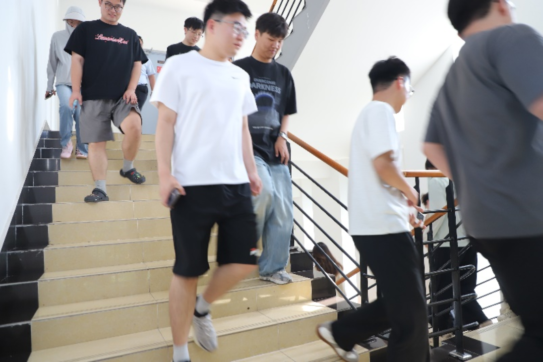 实战演练环节,在学院楼C座322自习室模拟了火灾现场。随着警报响起,正在自习的学生迅速启动应急预案,牢记"弯腰捂鼻、沿标撤离"等逃生技巧,快速有序沿安全通道撤离至集结点。