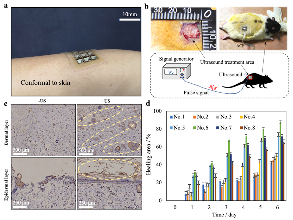 糖尿病是威胁人类生命健康的重大疾病之一,解决糖尿病带来的困扰,不仅仅是对血糖的控制,对糖尿病并发症的有效治疗也至关重要。其中,慢性伤口就是一种非常普遍的糖尿病并发症,由于糖尿病患者需要反复的扎手指测血糖,长期的注射胰岛素,更容易导致慢性伤口的形成,有时伤口反复发炎溃烂会造成截肢的严重后果。目前,对于慢性伤口的治疗多以控制炎症反应为主,只是缓解伤口的进一步发展,无法从细胞层面进行修复,伤口愈合显得十分困难。近年来的研究发现,超声波照射可以促进慢性伤口的愈合,但当前的超声器件尺寸大、材质硬、长时间固定困难,并且常常需要液体耦合剂的辅助等,不仅治疗效果不稳定还易诱发伤口的进一步感染。