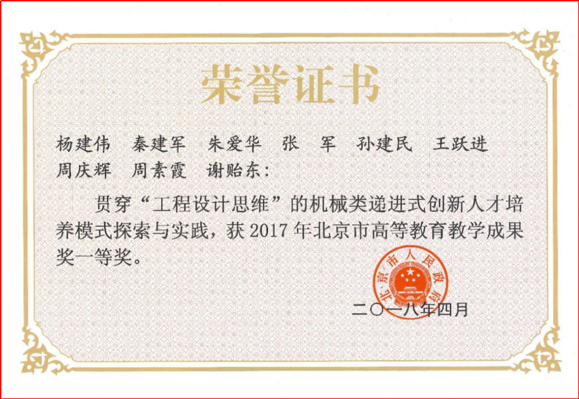 2022 BIG E和OBE融合驱动的新工科智能制造类卓越人才培养模式探索与实践 北京市人民政府/北京市教学成果奖二等奖